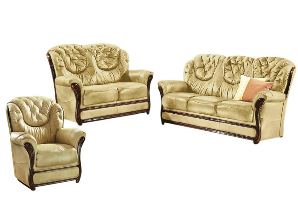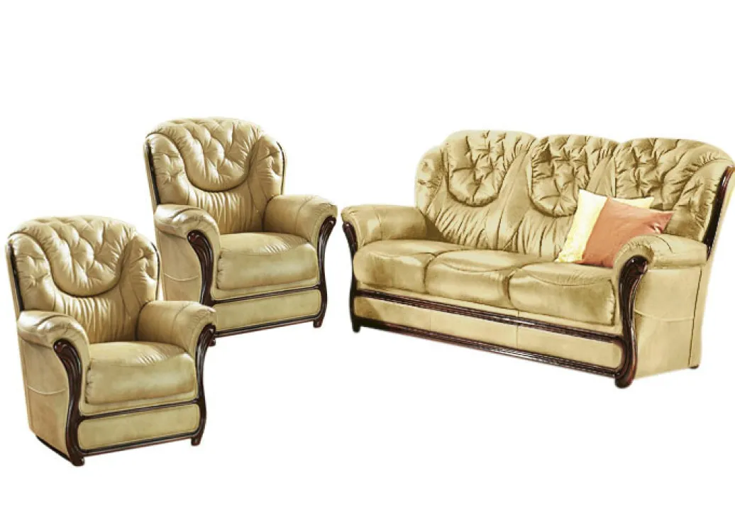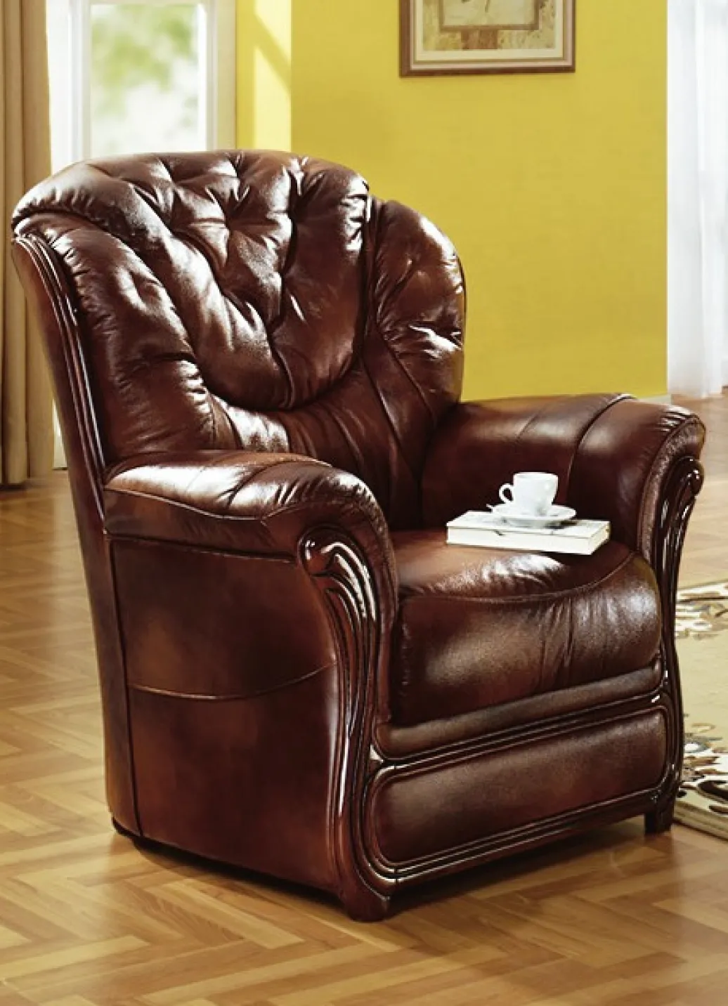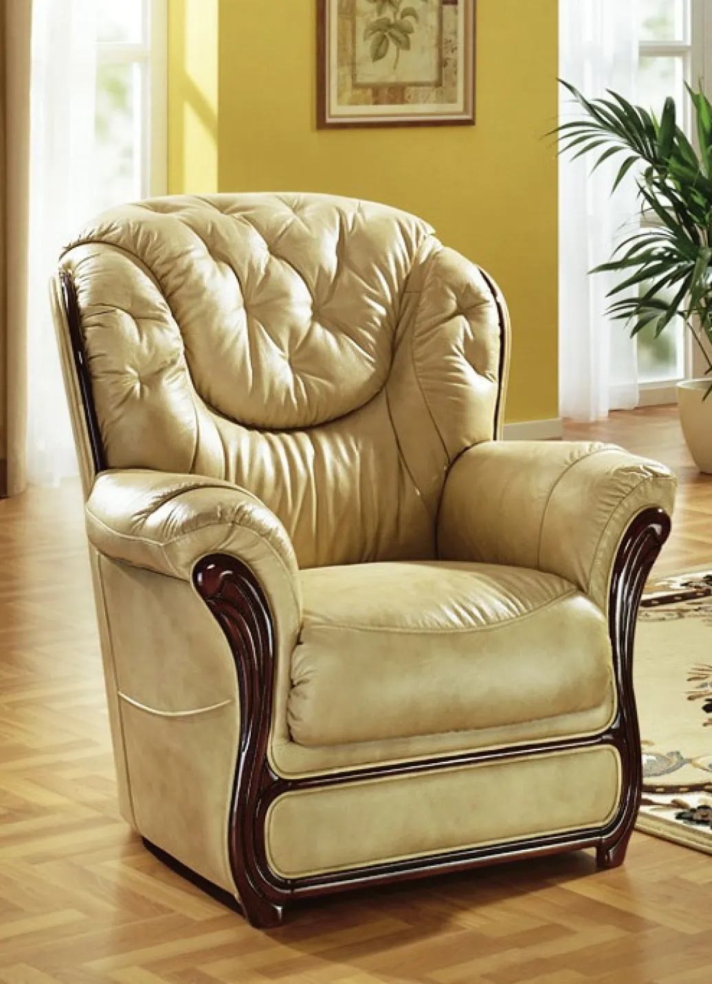 Polstermöbel mit Bezug aus echtem Leder in der Ausführung Sessel und in Antikbeige.