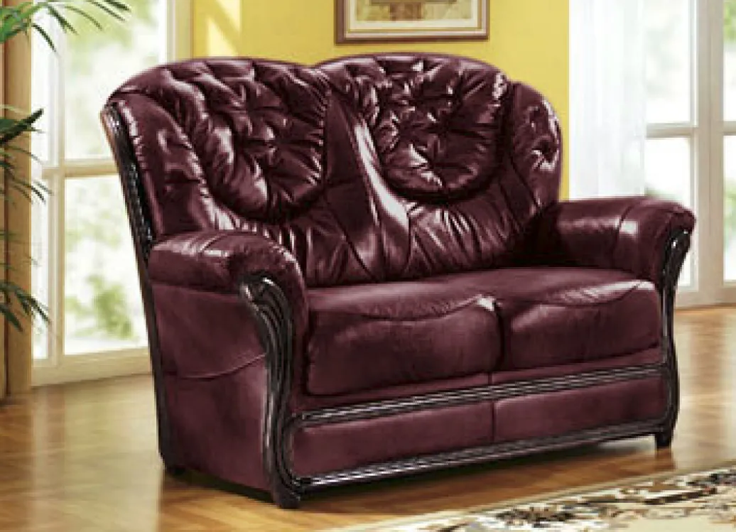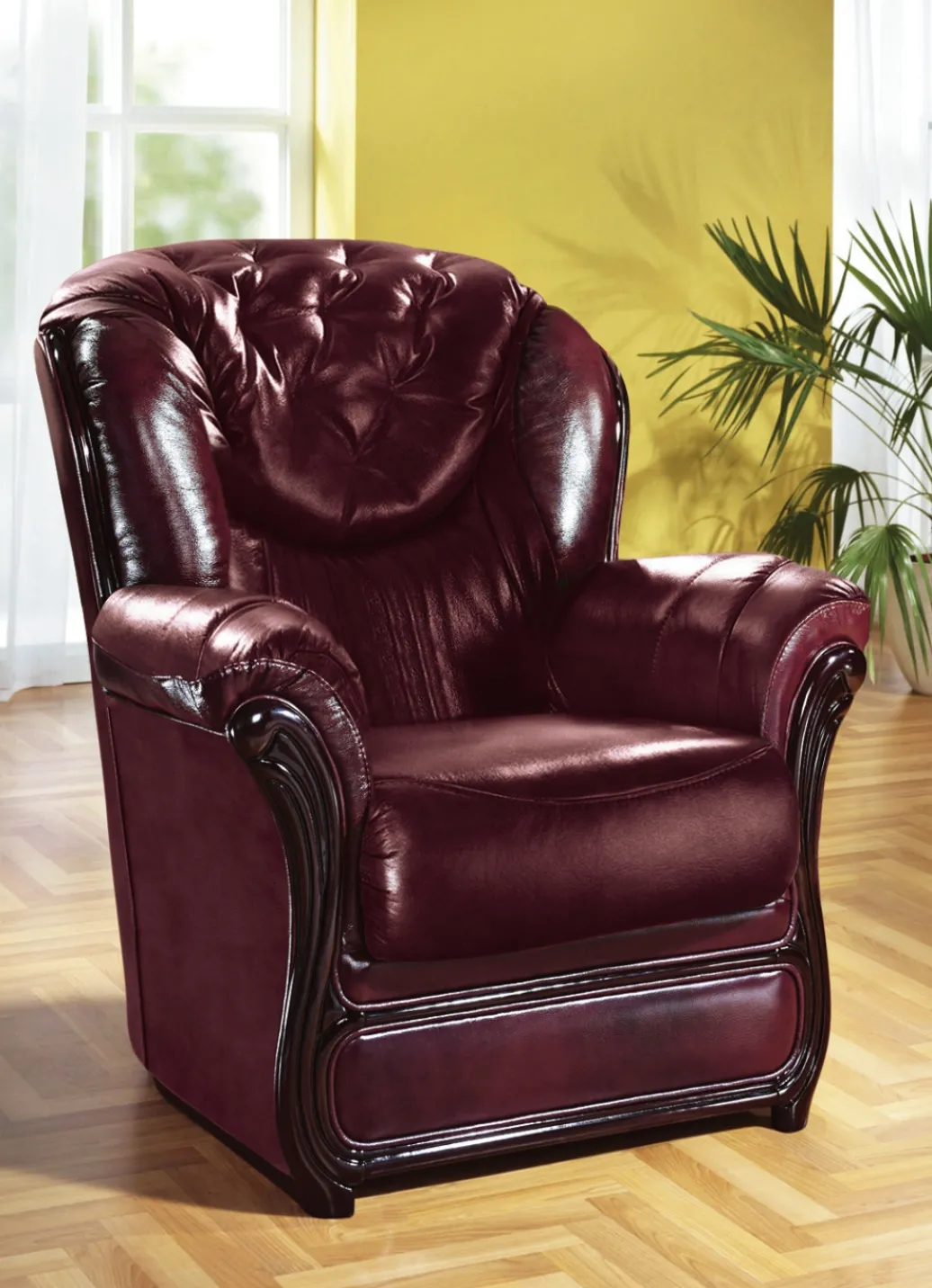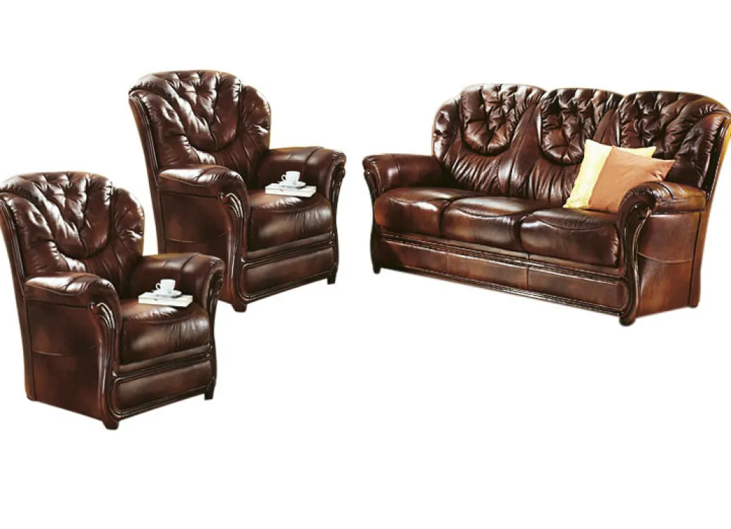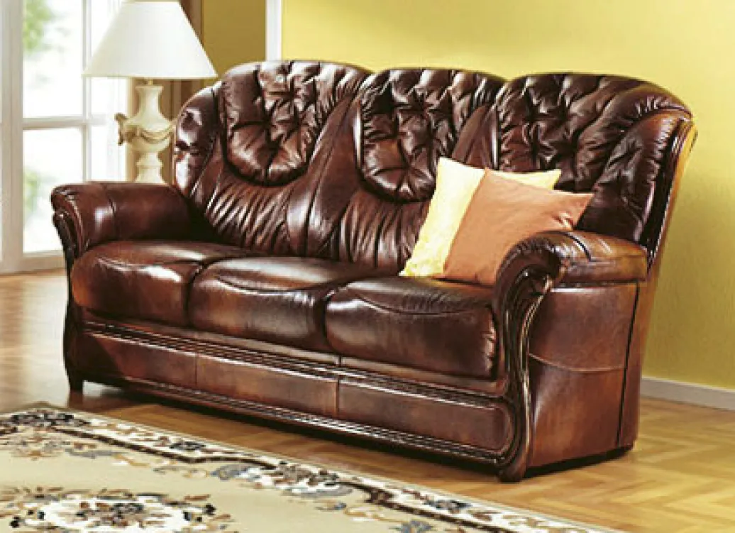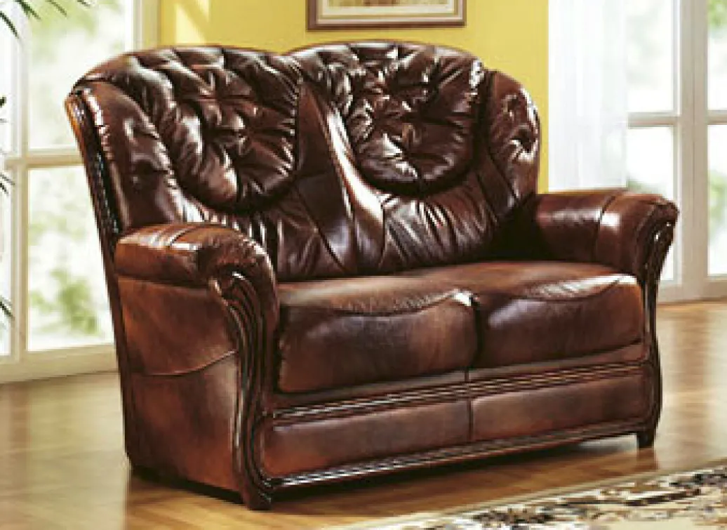 Geschmackvolle und komfortable Polstermöbel mit Bezug komplett aus echtem Leder. Auf stabilem Holzgrundgestell, mit bequemer Polsterung, wertvoll gestepptem Rücken sowie aufwendig gearbeiteten, nussbaumfarben lackierten Holz-Chatosen. Die Sitzkissen sind einzeln herausnehmbar. Rundum mit Leder bezogen, daher frei im Raum aufstellbar. Sitzhöhe 46 cm, Sitztiefe 49 cm.