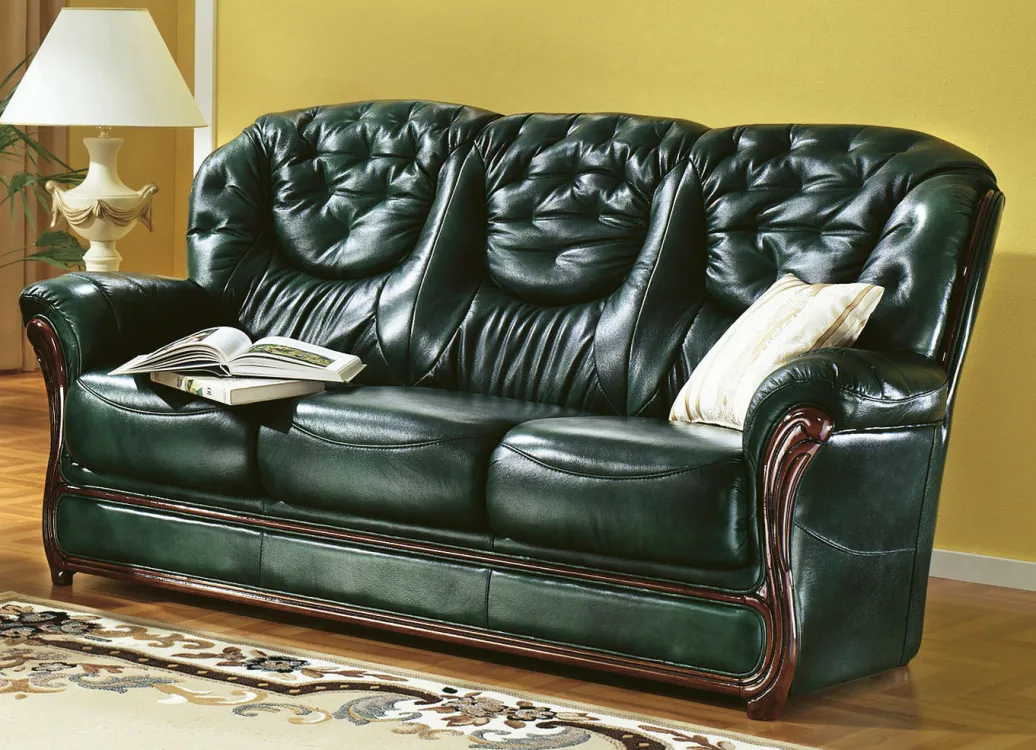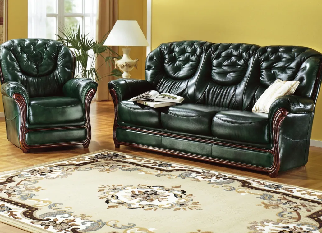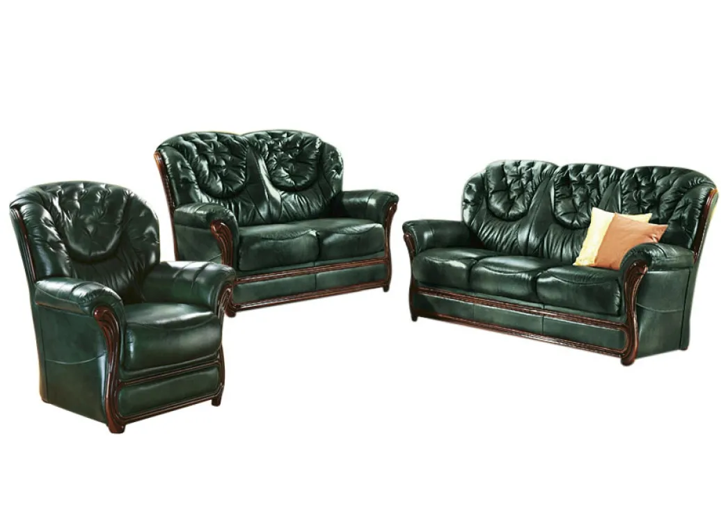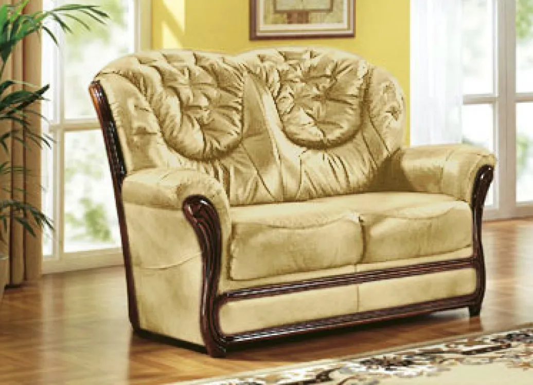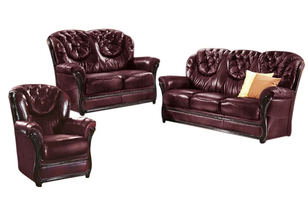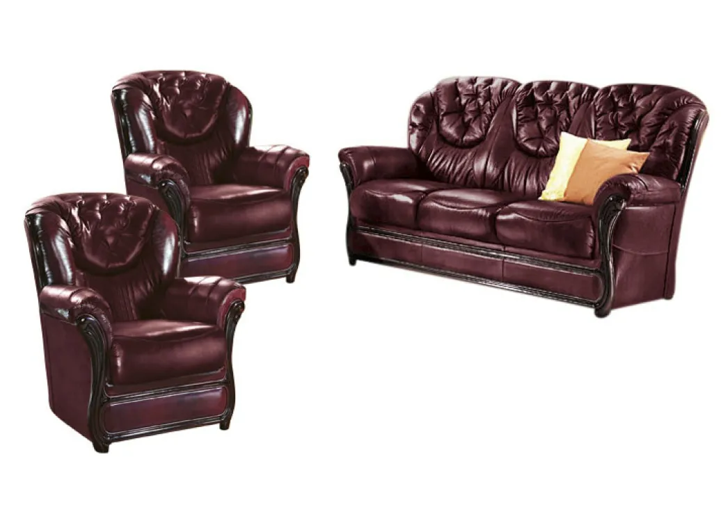 Geschmackvolle und komfortable Polstermöbel mit Bezug komplett aus echtem Leder. Auf stabilem Holzgrundgestell, mit bequemer Polsterung, wertvoll gestepptem Rücken sowie aufwendig gearbeiteten, nussbaumfarben lackierten Holz-Chatosen. Die Sitzkissen sind einzeln herausnehmbar. Rundum mit Leder bezogen, daher frei im Raum aufstellbar. Sitzhöhe 46 cm, Sitztiefe 49 cm.