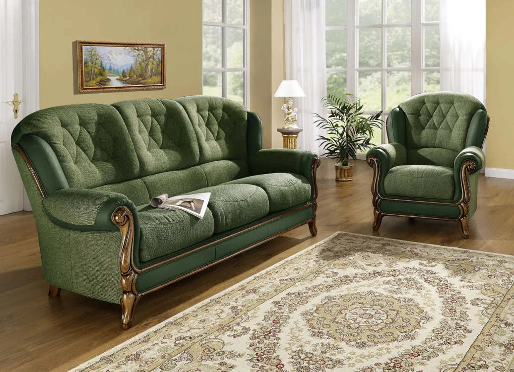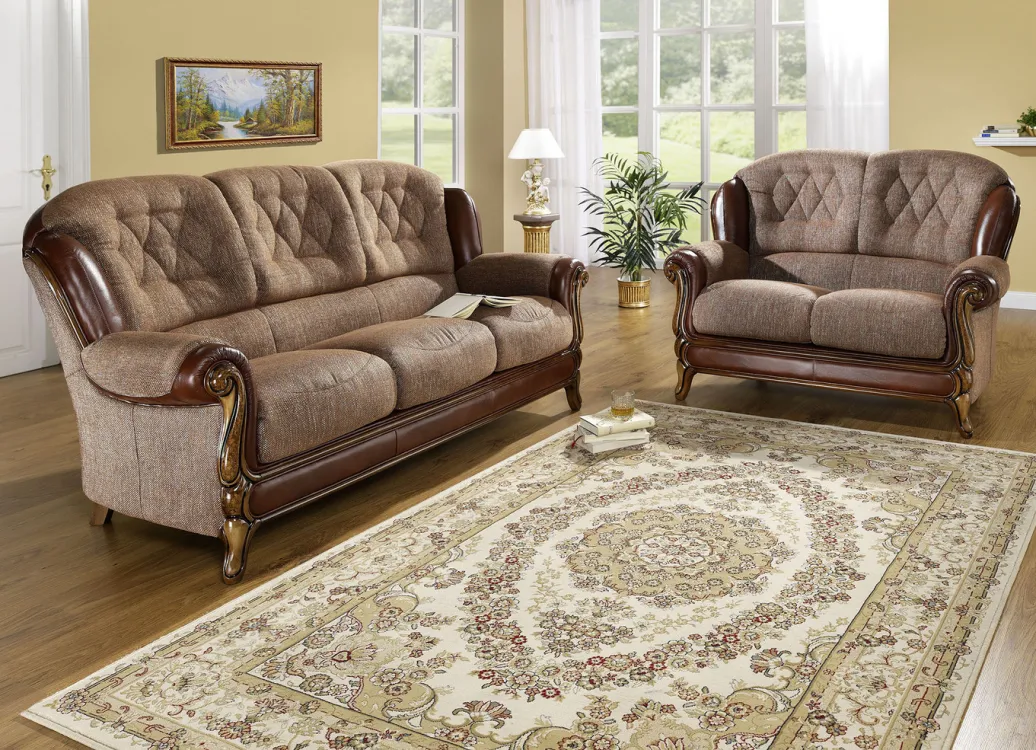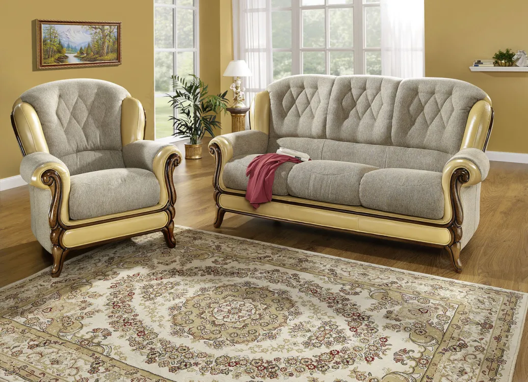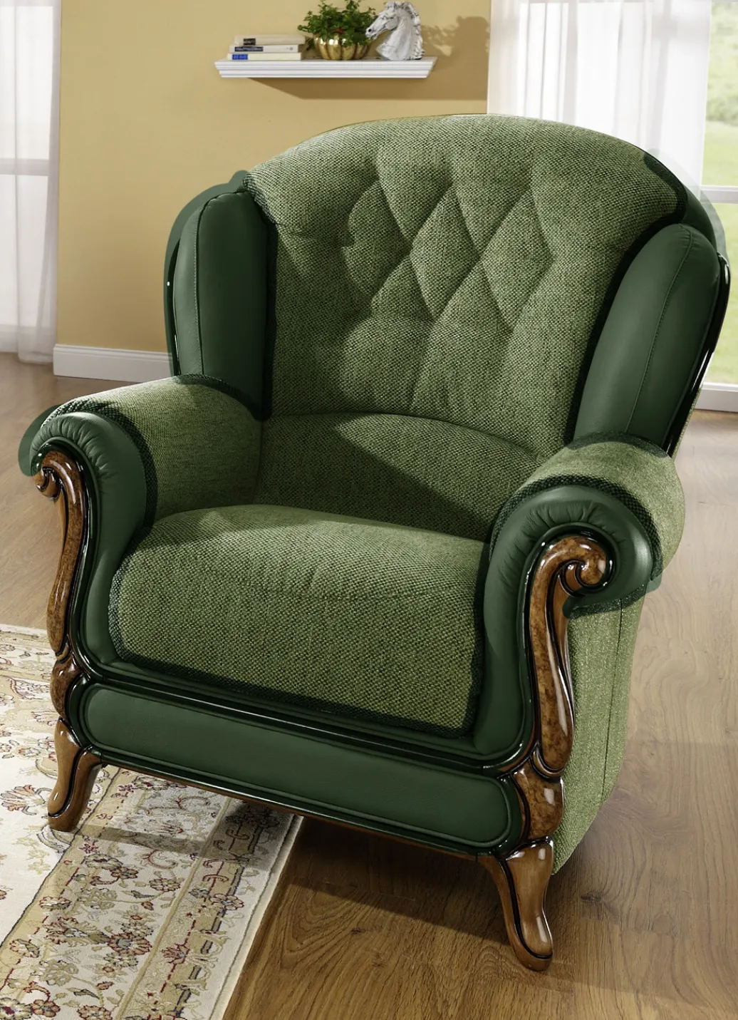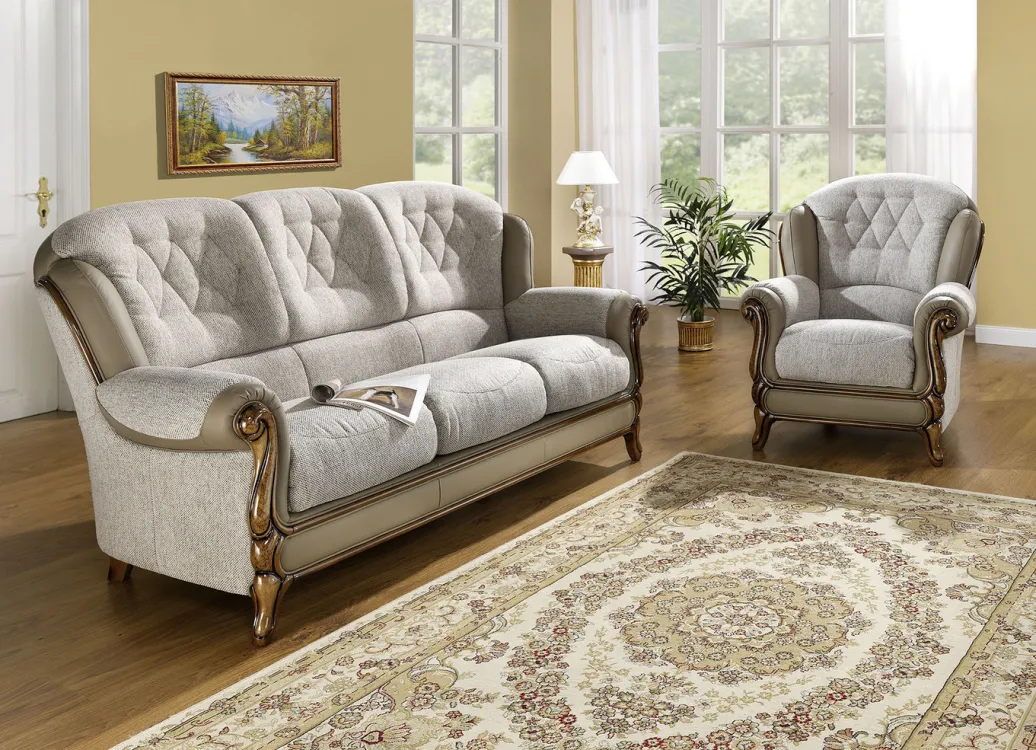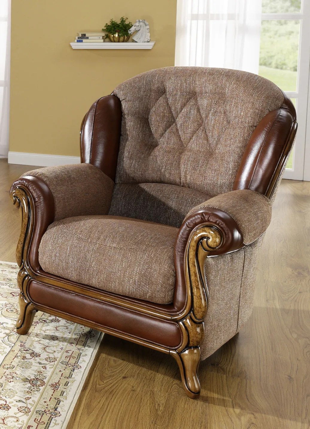 Diese exklusiven Polstermöbel sind nicht nur prachtvolle Hingucker, sondern bieten Ihnen und Ihren Gästen auch eine traumhaft bequeme Sitzgelegenheit. Auf massivem, nussbaumfarbenem Holzgrundgestell mit hochwertiger Polyurethanschaumstoff-Polsterung für höchsten Sitzkomfort. Mit edlen Schnitzereien gearbeitete Holzchatosen in Hochglanzoptik. Angenehmer Bezug aus Webstoff (100% Polyester) mit dekorativen Echtlederabsetzungen. Die Rückseiten sind original bezogen, daher frei im Raum aufstellbar. Maße: Höhe je 102 cm, Sitzhöhe je 53 cm, Sitztiefe je 47 cm. Die Lieferung erfolgt aufgebaut