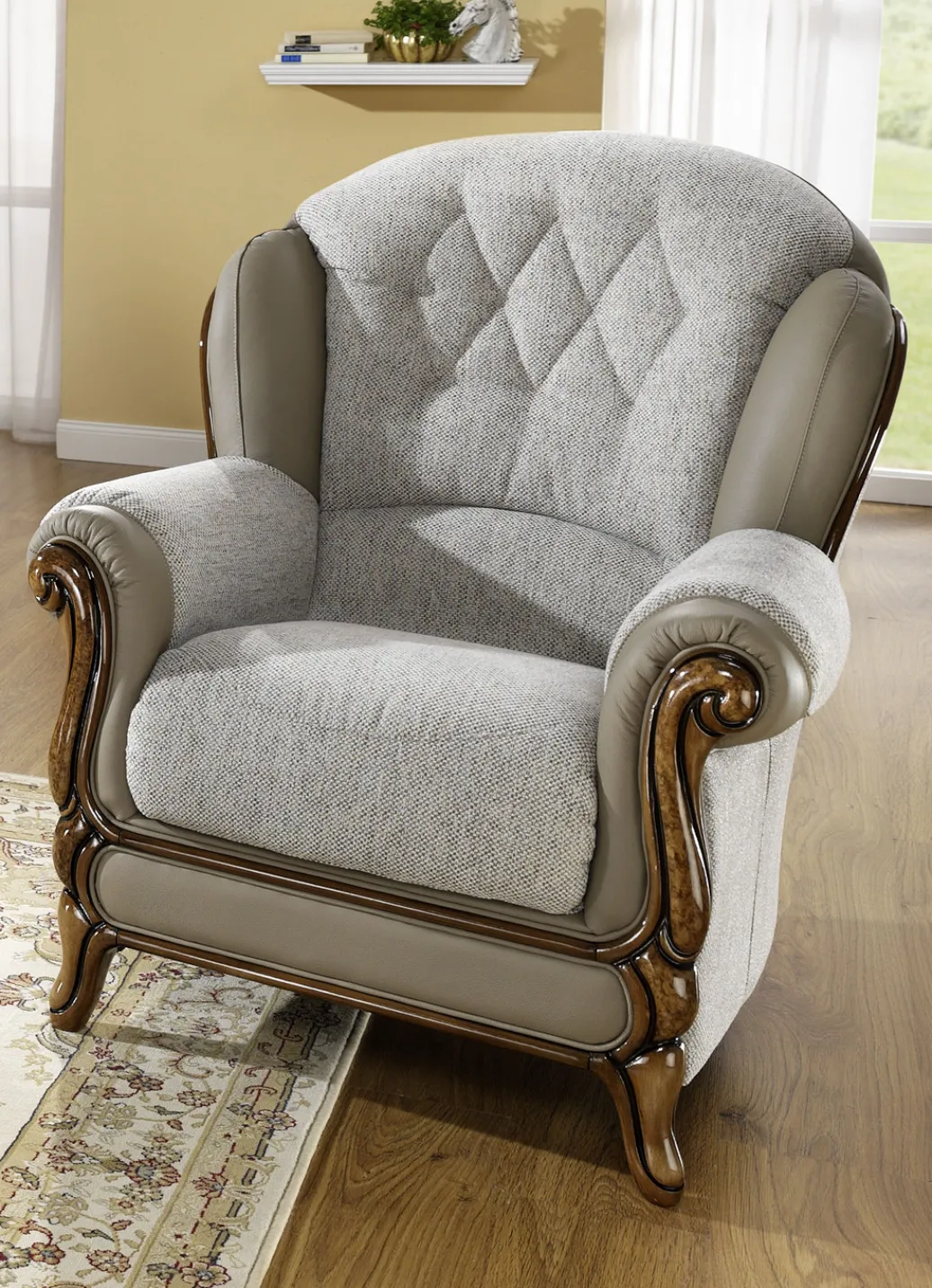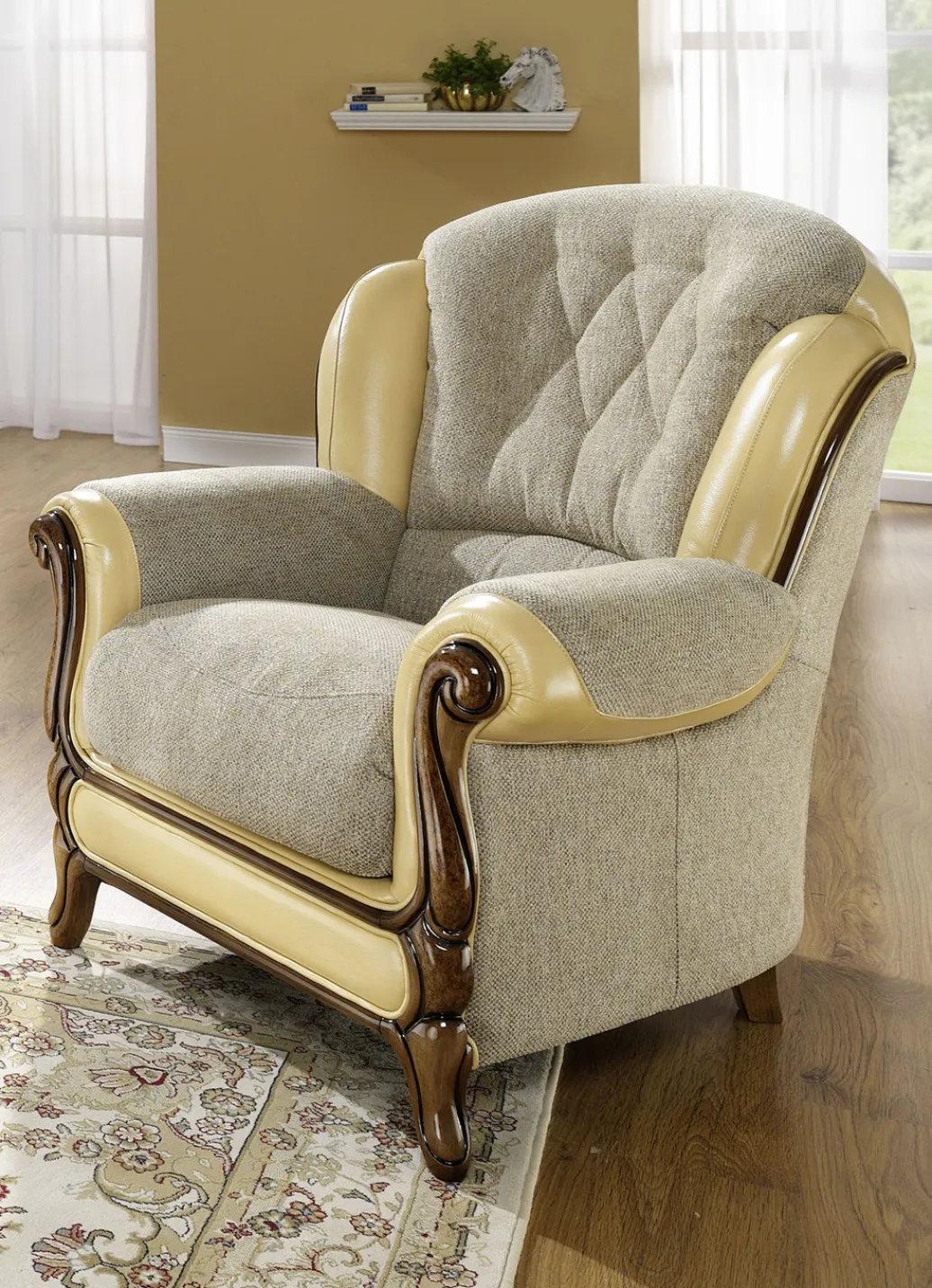 Polstermöbel mit edlen Holzchatosen in der Ausführung Sessel und in Beige.