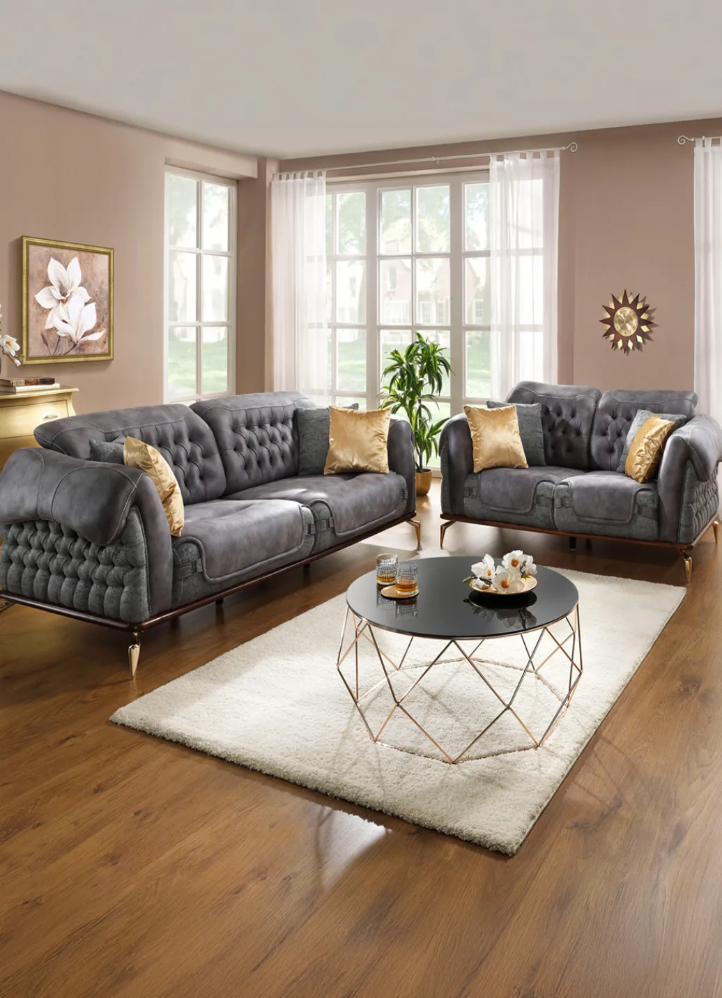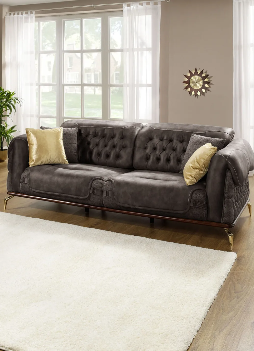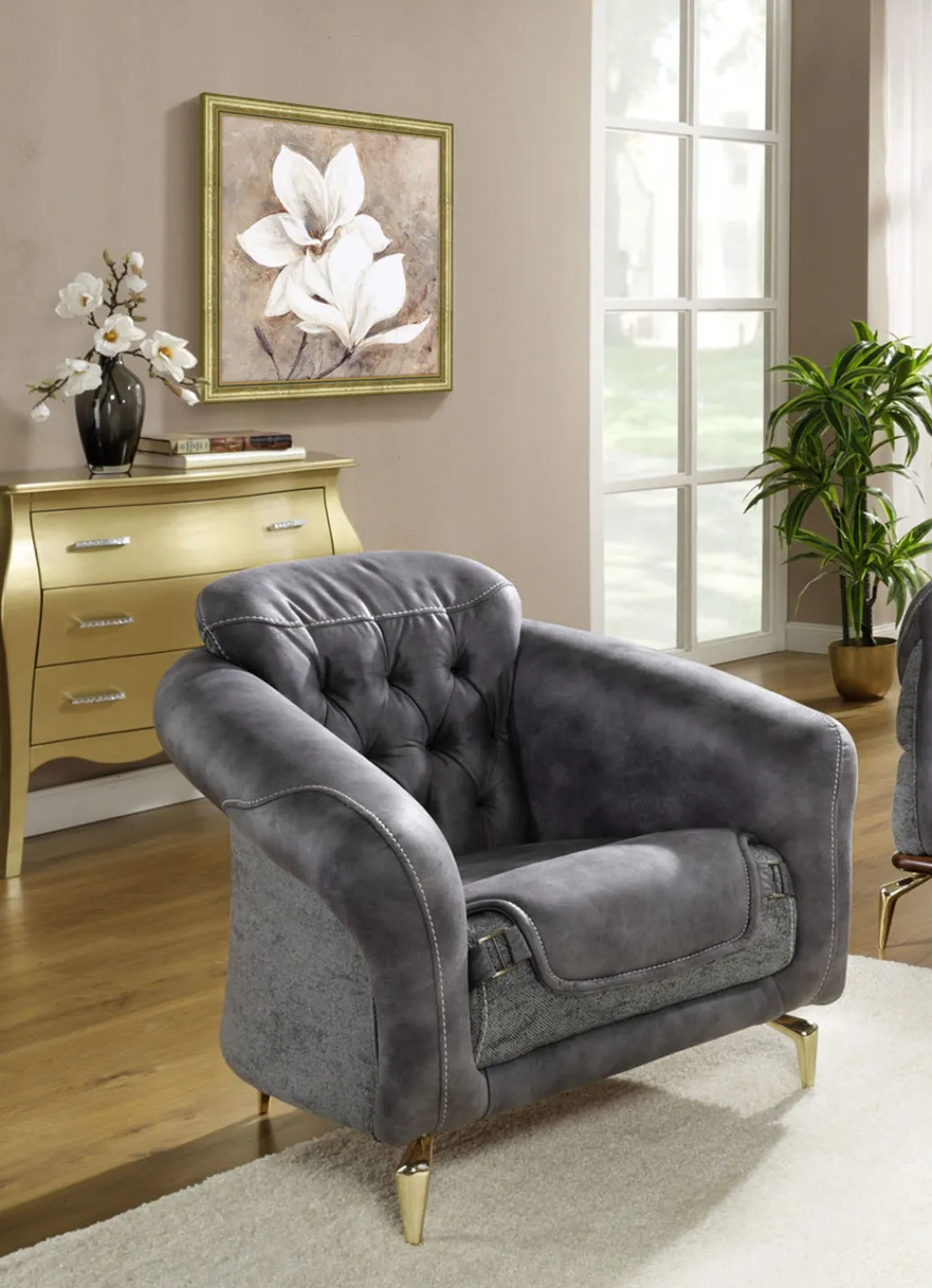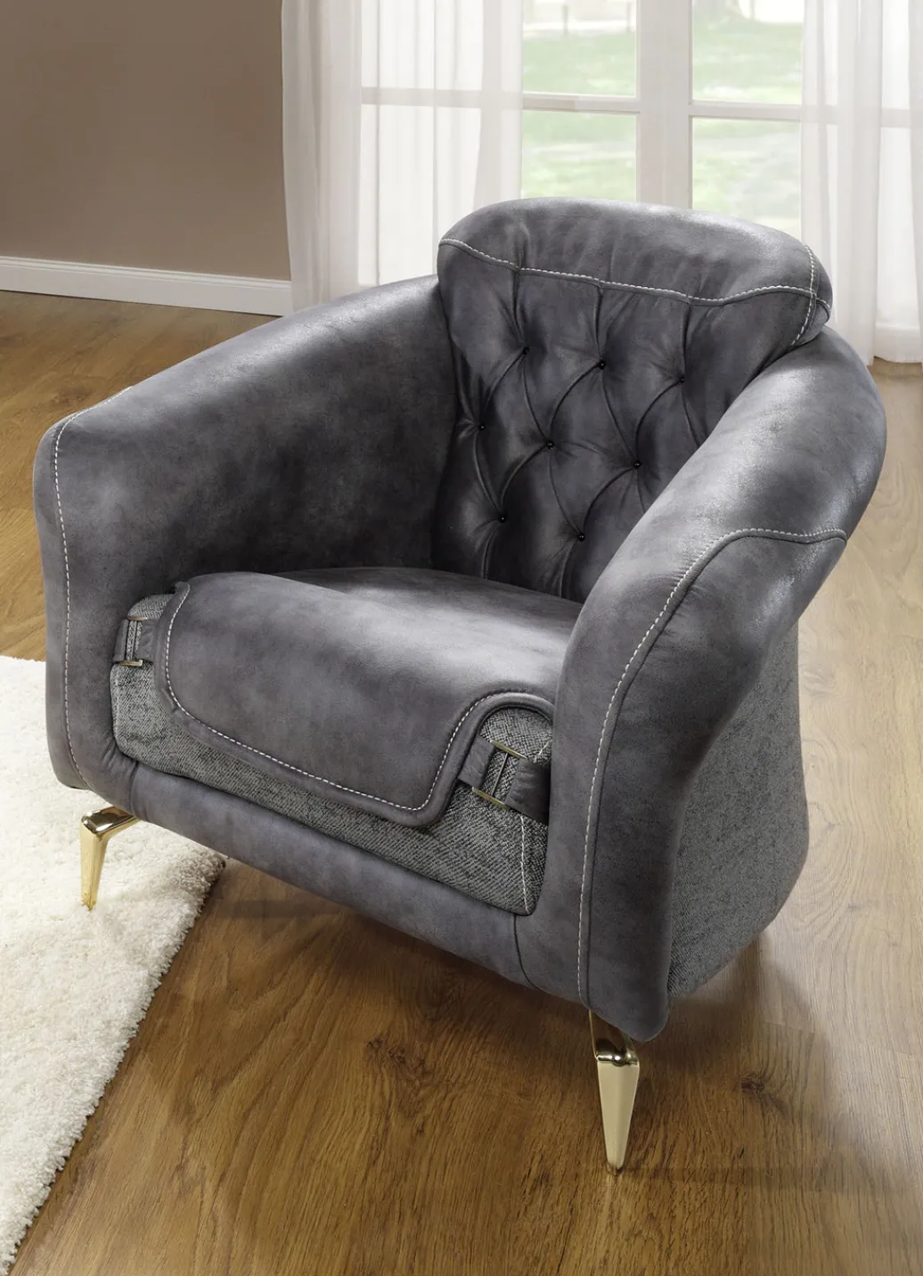 Diese prachtvollen Polstermöbel verleihen Ihrem Wohnraum eine äußerst elegante Ausstrahlung! Auf stabilem, sichtbarem Echtholz-Untergestell, mit komfortabler Nosagfederung in den Sitzflächen und Polyätherschaum-Polsterung in den Rückenlehnen gearbeitet. Super angenehmer Bezug aus Polyester (100% Polyester). Auf hochwertigen, goldfarbenen Metallfüßen. Rückseiten Original bezogen, daher frei im Raum aufstellbar.
