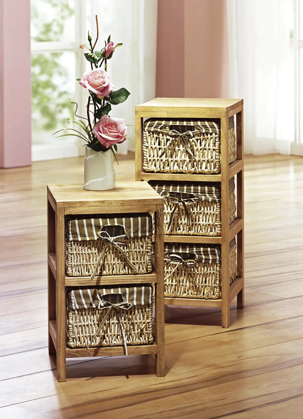 Regale aus massivem Holz, mit schön sichtbarer Holz-Struktur auf der Oberfläche sowie Körben aus Mais Stroh-Geflecht, die mit einem braun-beige gestreiften Stoff-Einsatz ausgekleidet sind, 80% Polyester und 20% Baumwolle. Die Lieferung erfolgt aufgebaut