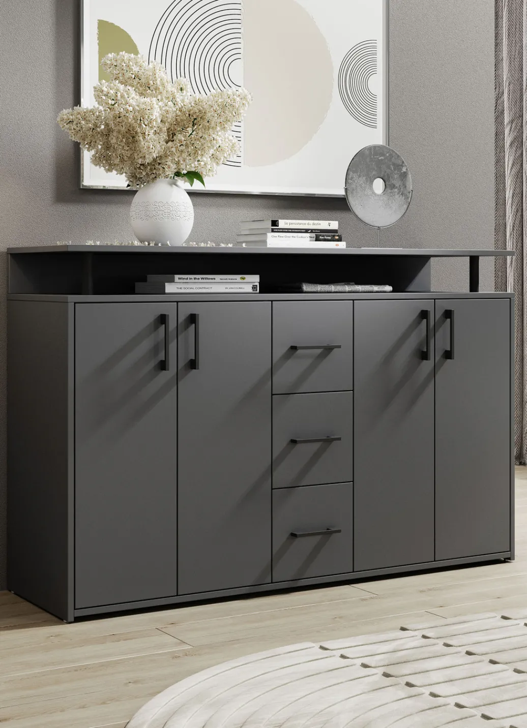 Setzen Sie mit diesem tollen Highboard mit Melaminbeschichtung ein stilsicheres Highlight in Ihrem Wohnraum! Mit 1 breiten, offenen Fach unter der Deckplatte, 4 Türen, dahinter links und rechts 1 Einlegeboden sowie 3 Schubladen auf Kugelauszügen. Mit Bügelgriffen aus Kunststoff. Auf runden Kunststoff-Möbelgleitern. Maße: B139xH90xT34 cm. Mit Aufbau-Anleitung.