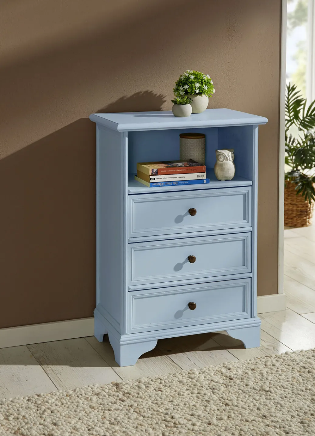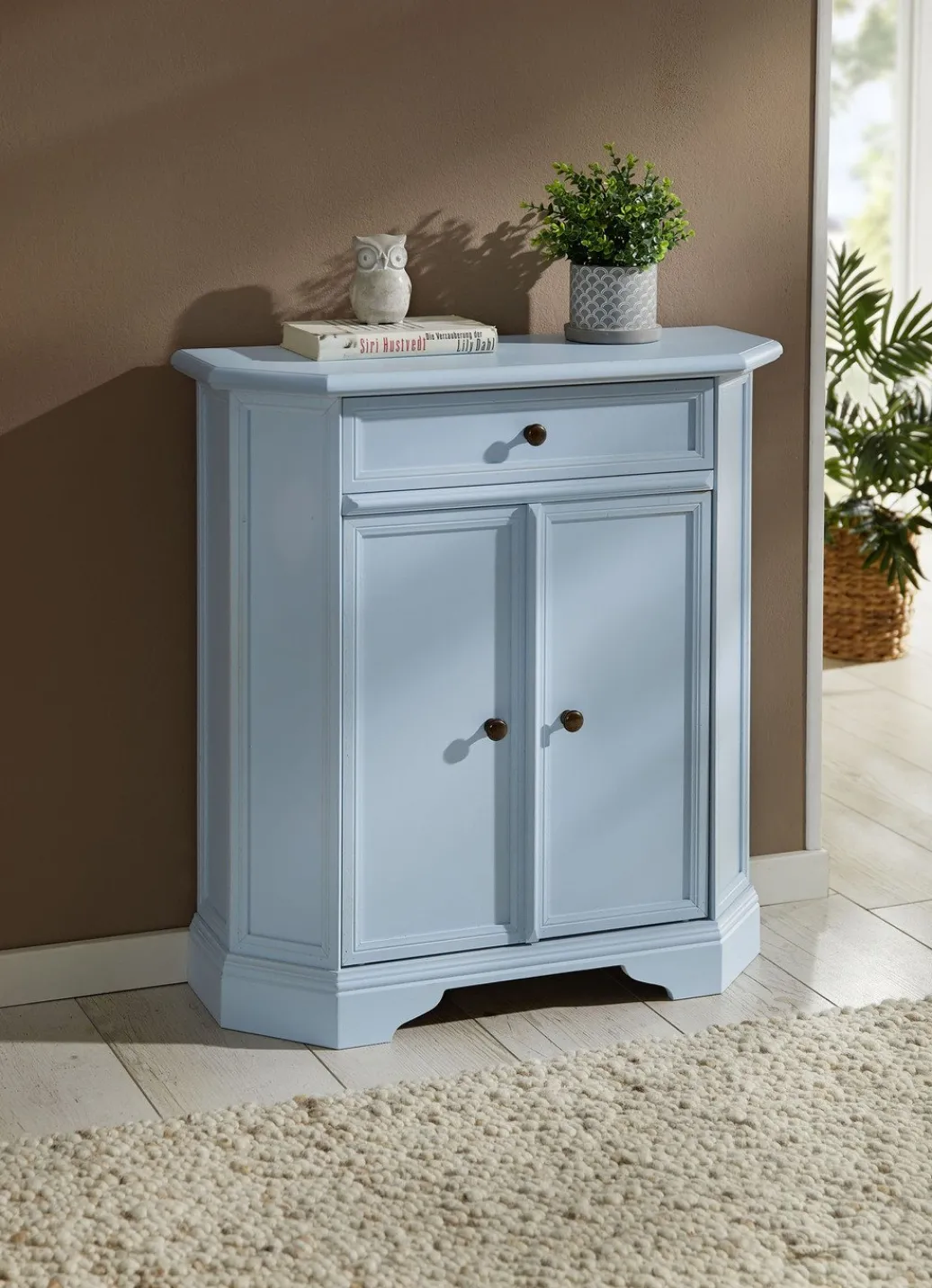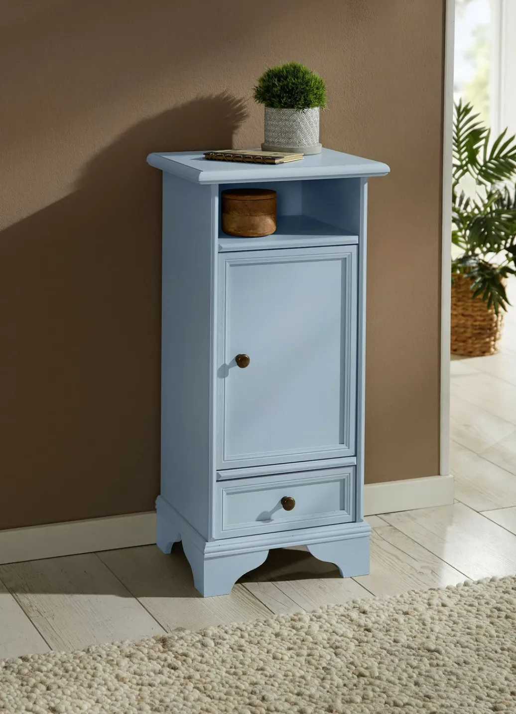 Teilmassive Kommodenserie in der Ausführung Kommode, 1-türig und in Pastellblau.