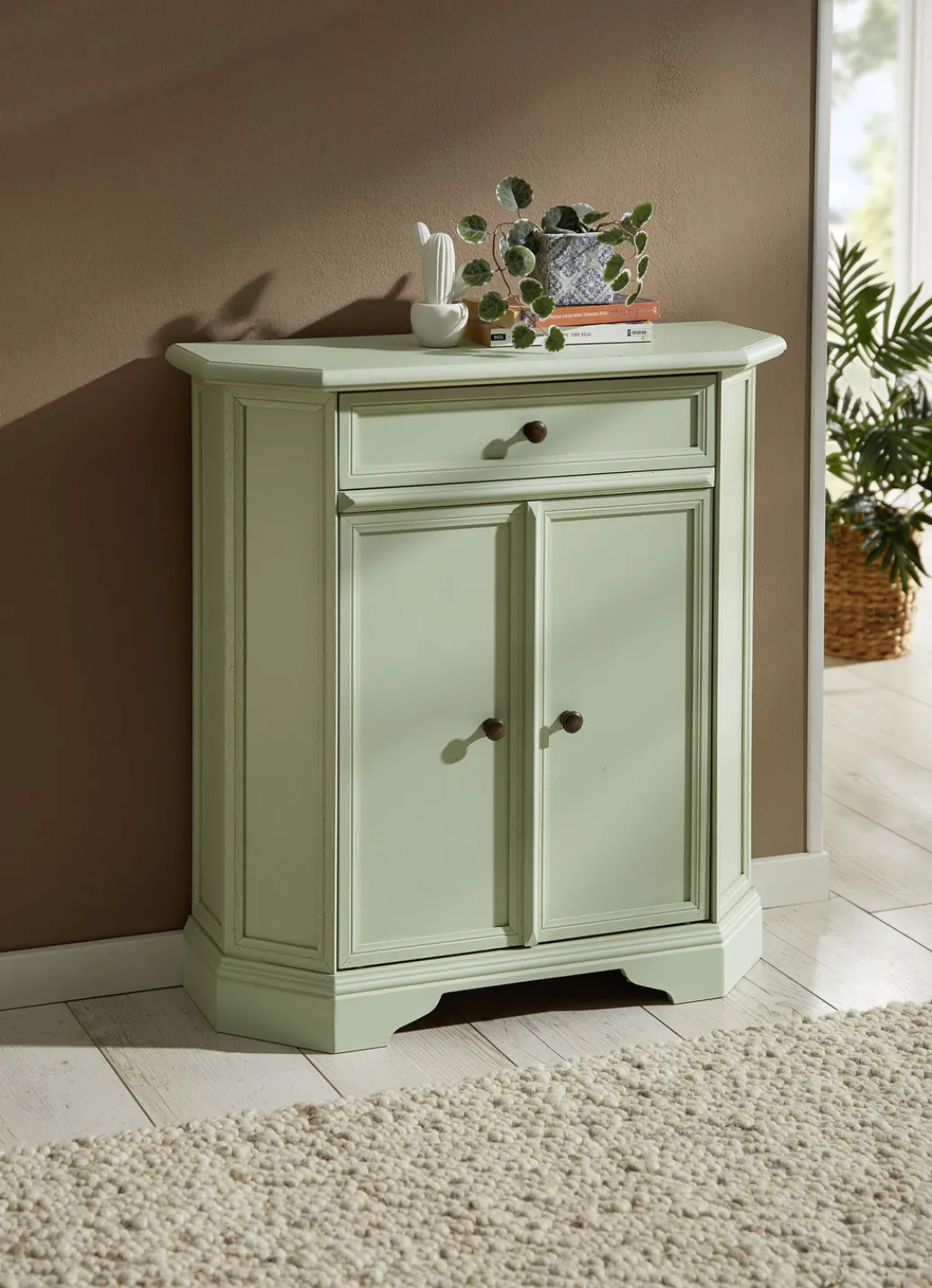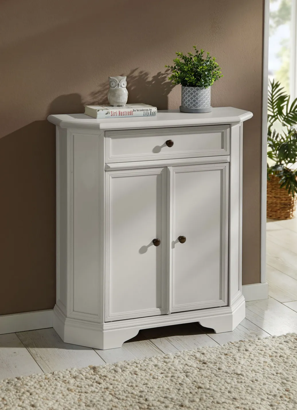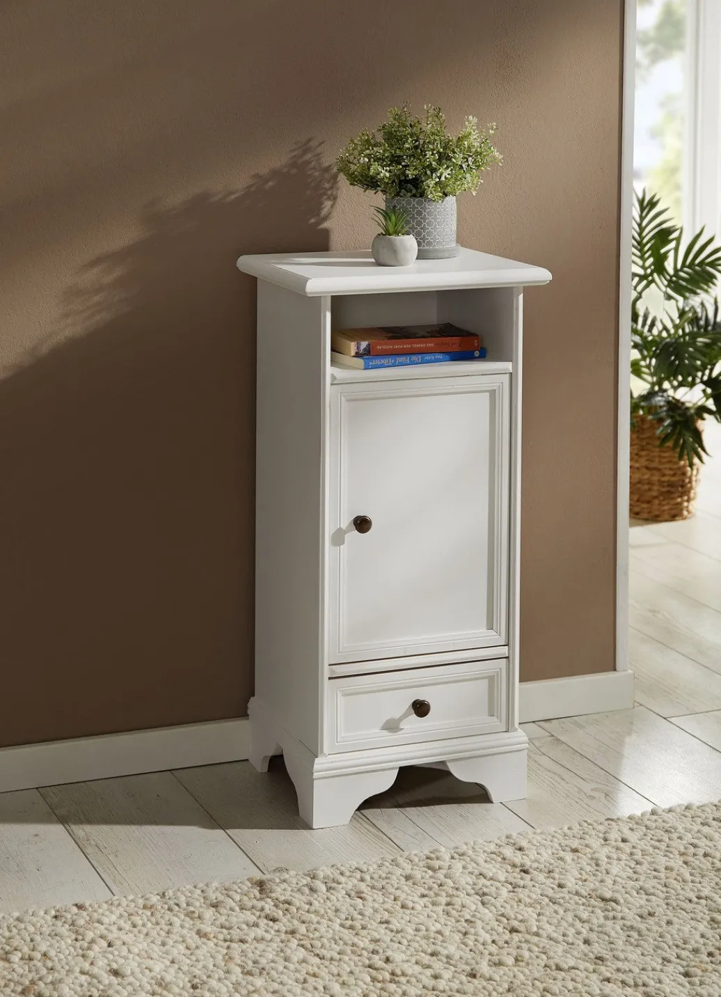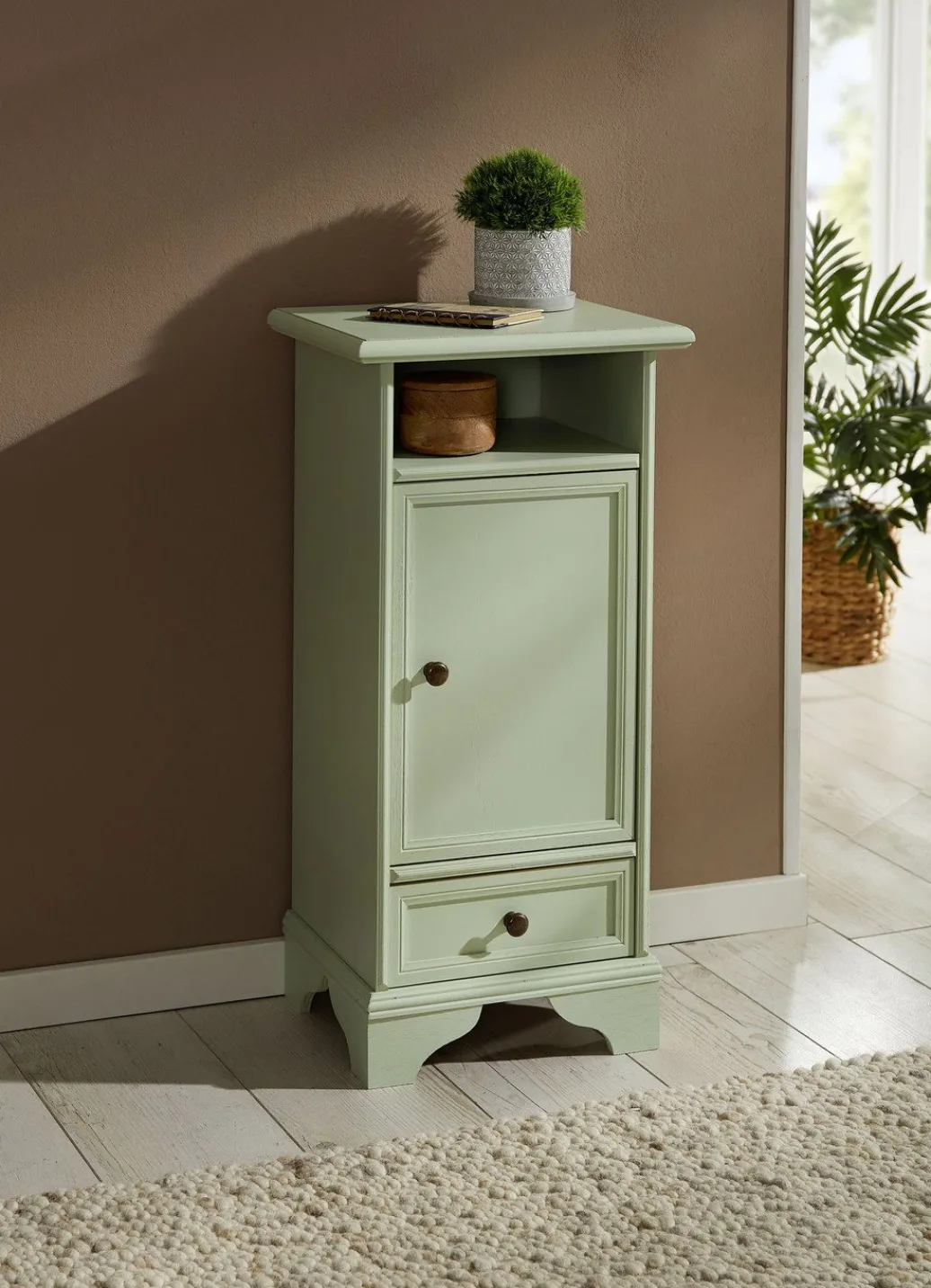 Kommode, 1-türig: Mit 1 Tür, dahinter 1 fester Boden, darunter 1 Schublade, darüber 1 offenes Fach. Maße: B36xH75xT29 cm