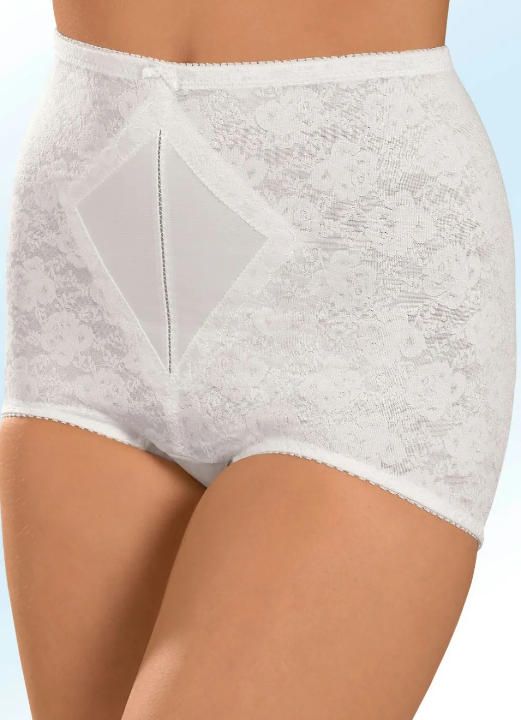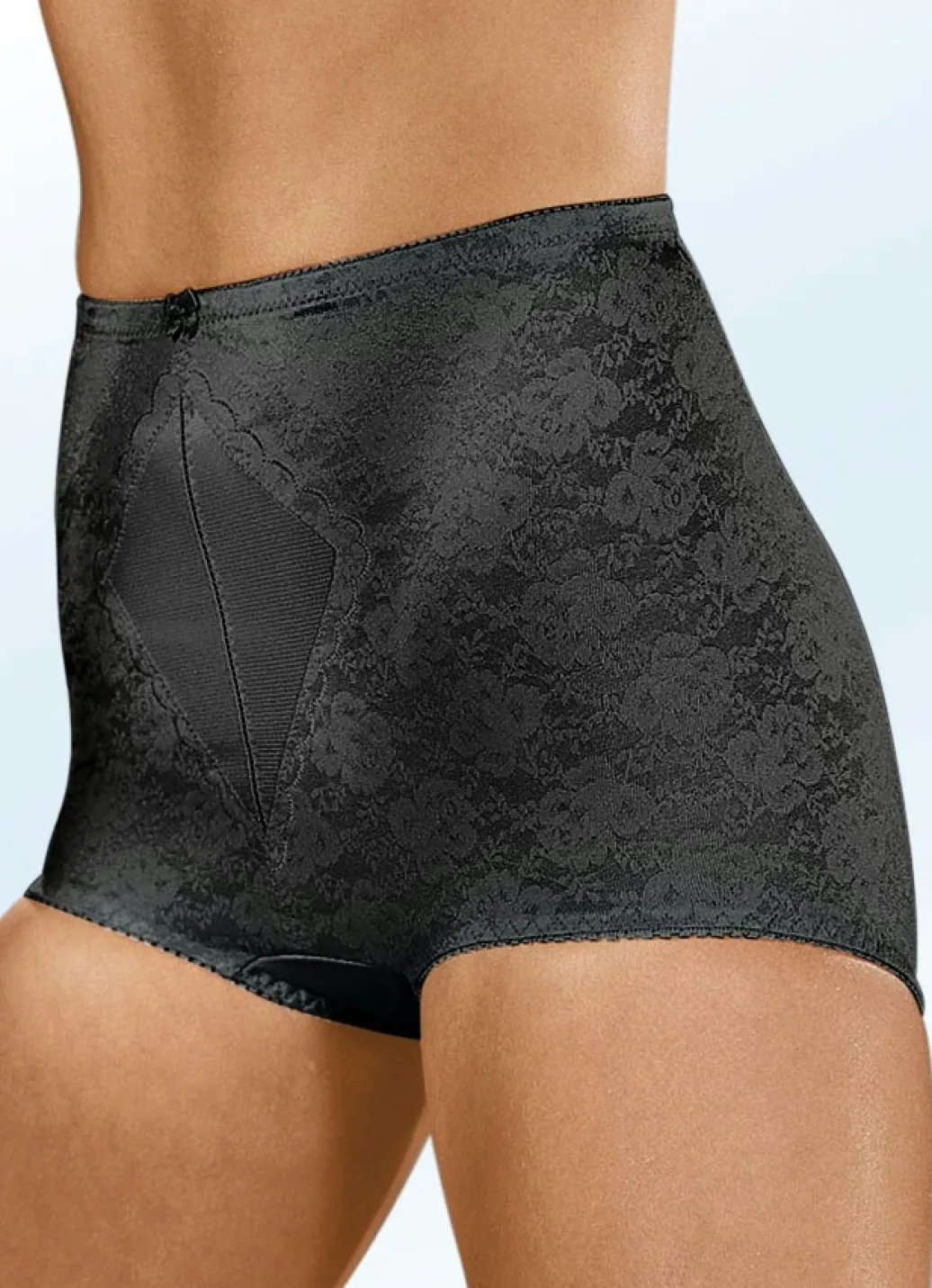 Miederhose von „Naturana“, mit Jacquarddessin, glänzendem, verstärktem Vorderteileinsatz sowie Baumwolleinlage im Schritt.