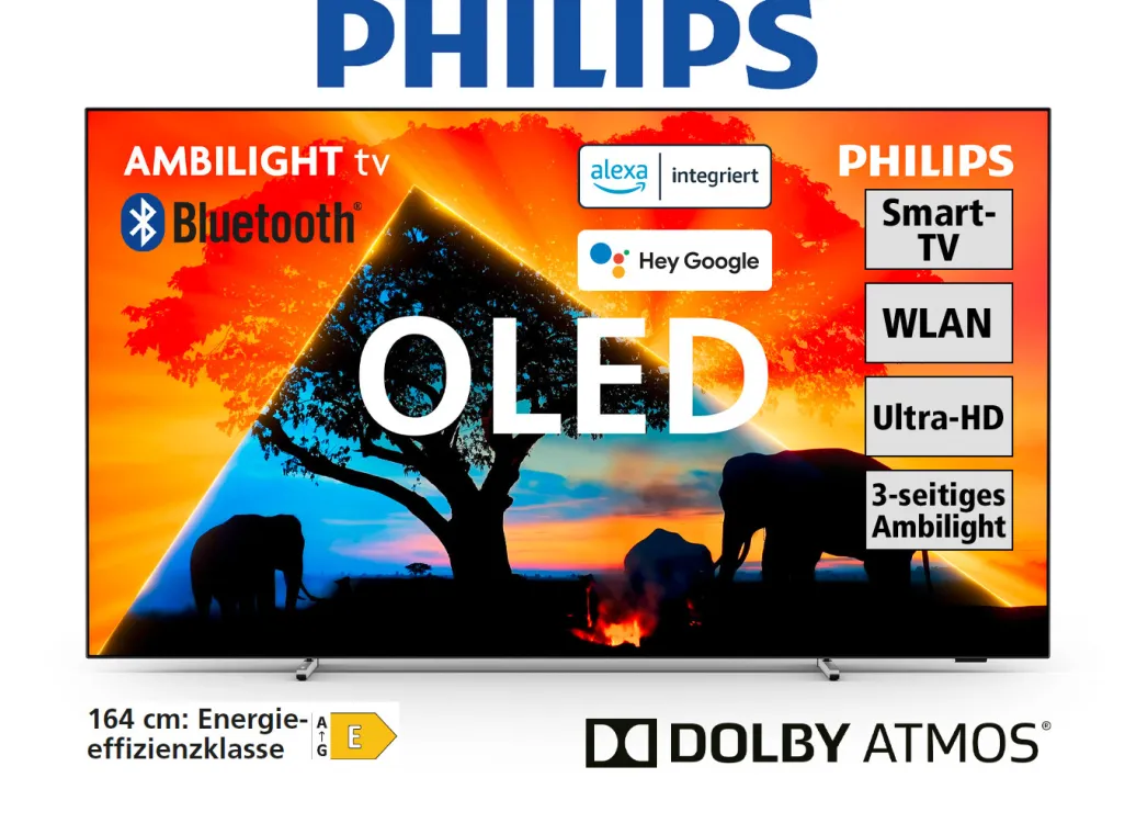 Philips 48OLED759/12. 4K-Ultra-HD OLED-Ambilight-TV mit 120 Hz, Titan OS Betriebssystem, Smart-TV, Bluetooth, WLAN, Alexa und Google-Assistant kompatibel. HDR10+, Dolby Vision und Dolby Atmos, 3-seitiges-Ambilight für faszinierende farbige Lichteffekte. P5 Picture Engine mit KI. Mit sprachgesteuerter Fernbedienung. Integrierter 3-fach Receiver.