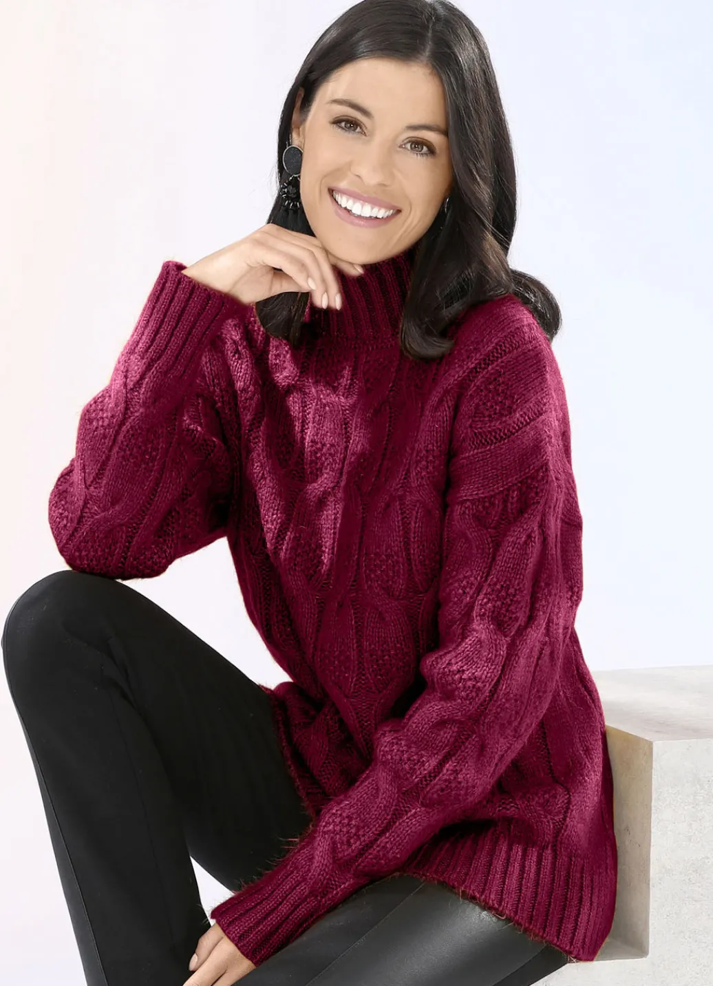 Ein superflauschiges Lieblingsstück ist dieser pfiffige Pullover: Stehbund, Alloverstruktur mit Zopfdessin und Reiskornstrickakzenten, lange Ärmel sowie Rippenstrickabschlüsse.