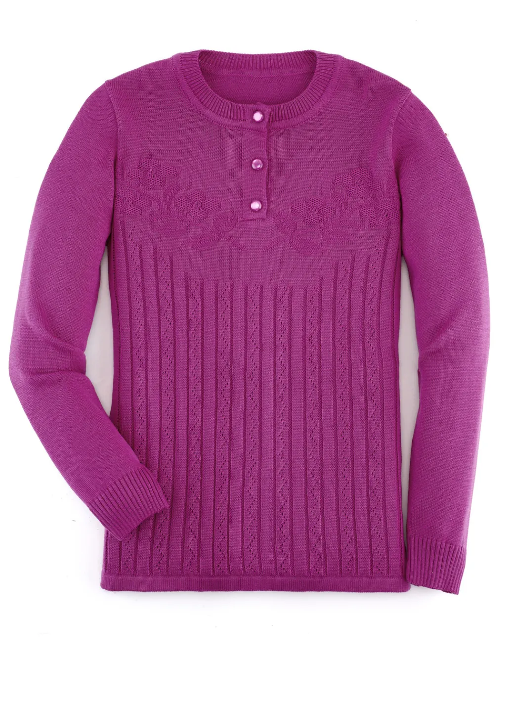 Dieser faszinierende Pullover wird Sie begeistern: runder Halsausschnitt, kurze Knopfleiste, florale und streckende Längsstruktur mit feinen Ajourakzenten im Vorderteil sowie Rippenbündchen an den Abschlüssen der langen Ärmel.