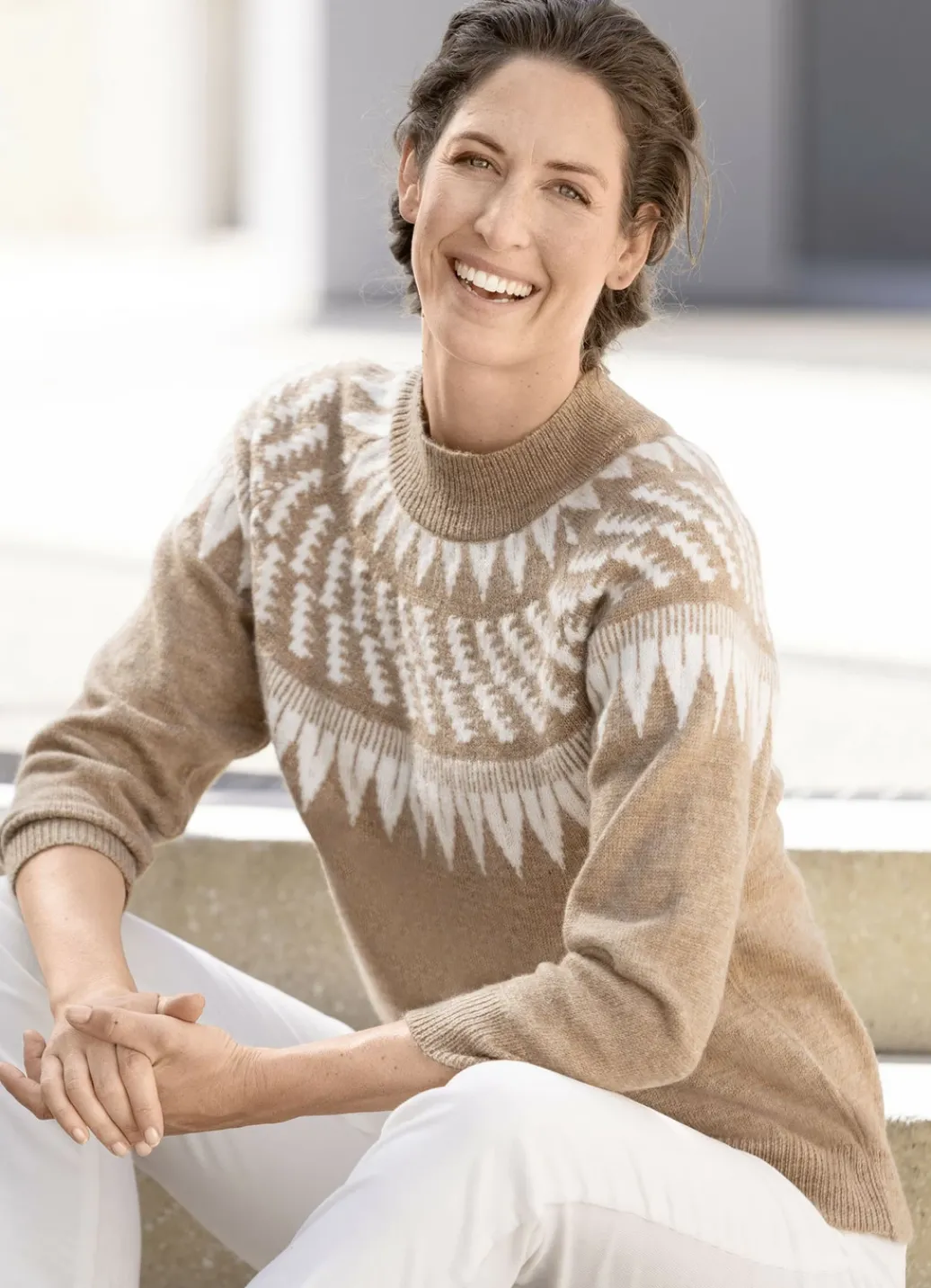 Herrlicher Pullover in Camel-Ecru, mit pfiffigem Norwegermuster, tollem Allover-Melange-Effekt, Stehbund, langen Raglanärmeln sowie Saum mit Rippenbund.