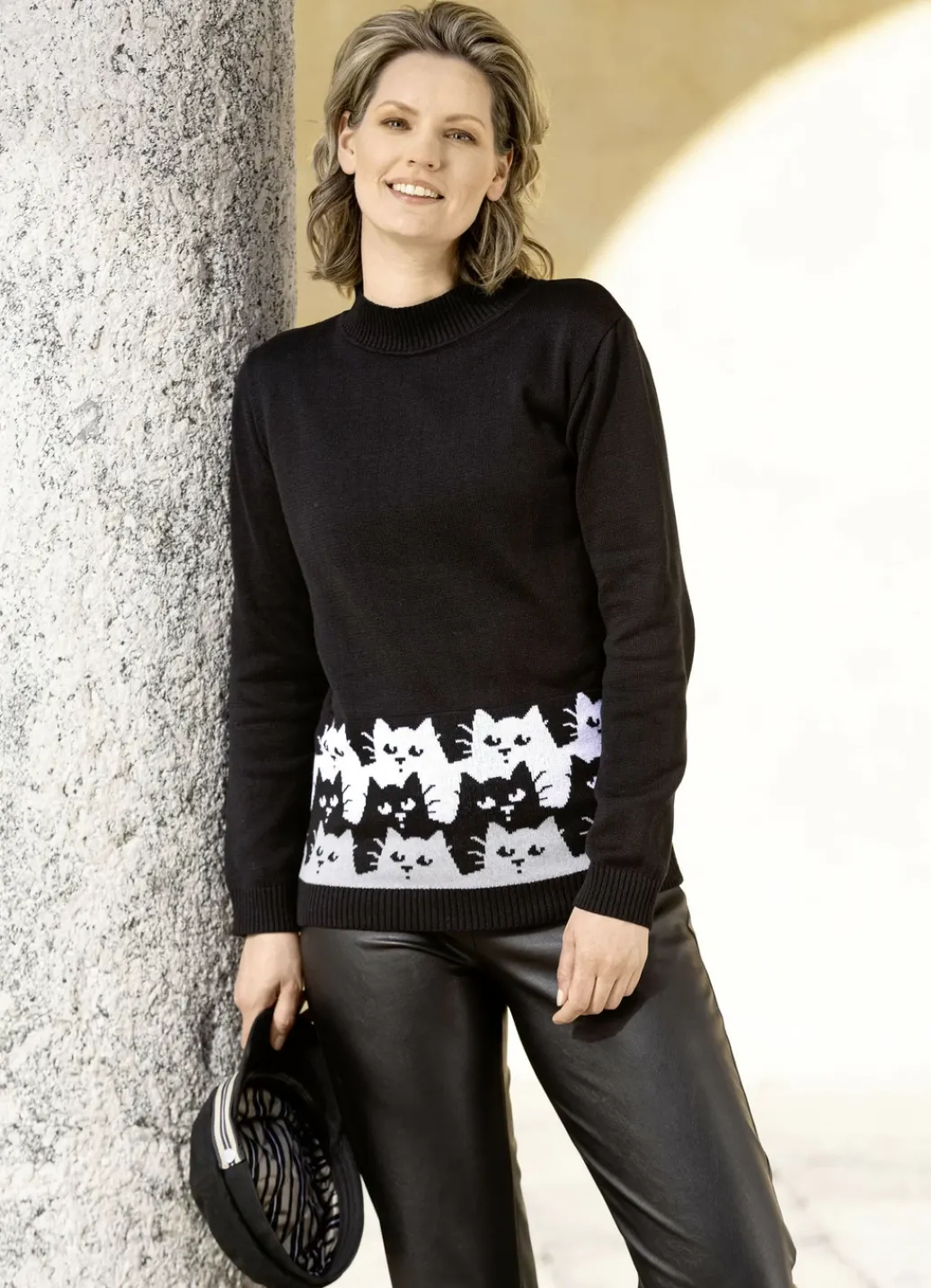 Lassen Sie sich von diesem wunderschönen Pullover mit aufwendigem, schwarz-weiß-grauem Jacquard-Dessin mit witzigen Katzenmotiven verzaubern: Stehbund sowie Rippenabschlüsse an den langen Ärmeln und am Saum.