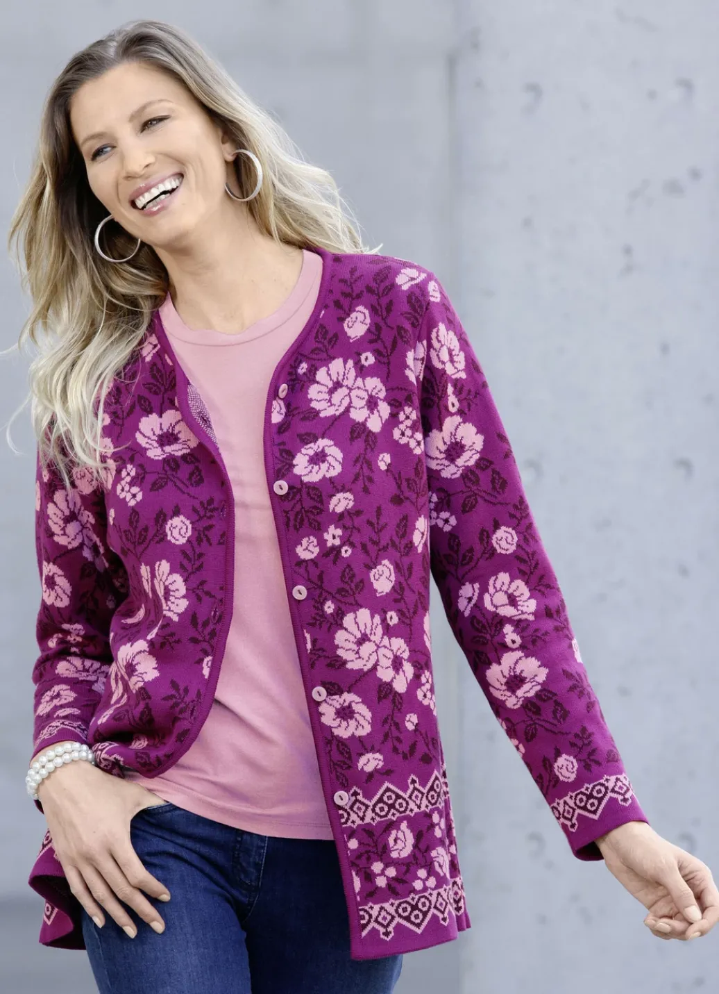 Aufwendige Jacquardstrickjacke in Fuchsia-Rosé-Bordeaux, mit herzförmigem Ausschnitt, durchgeknöpft, langen Ärmeln sowie schönem Jacquardmuster allover.