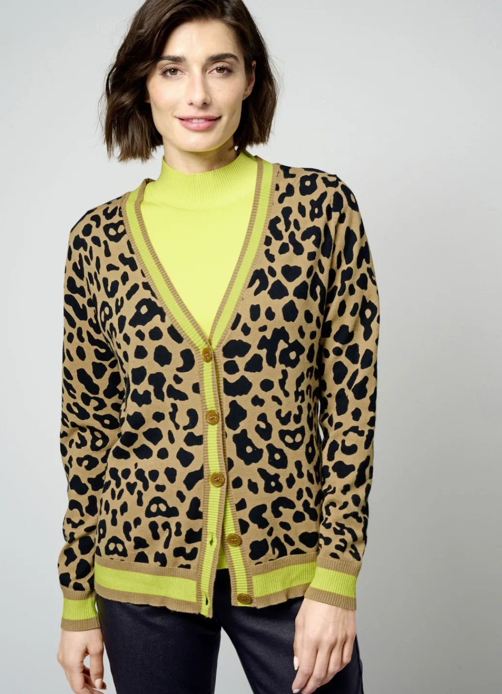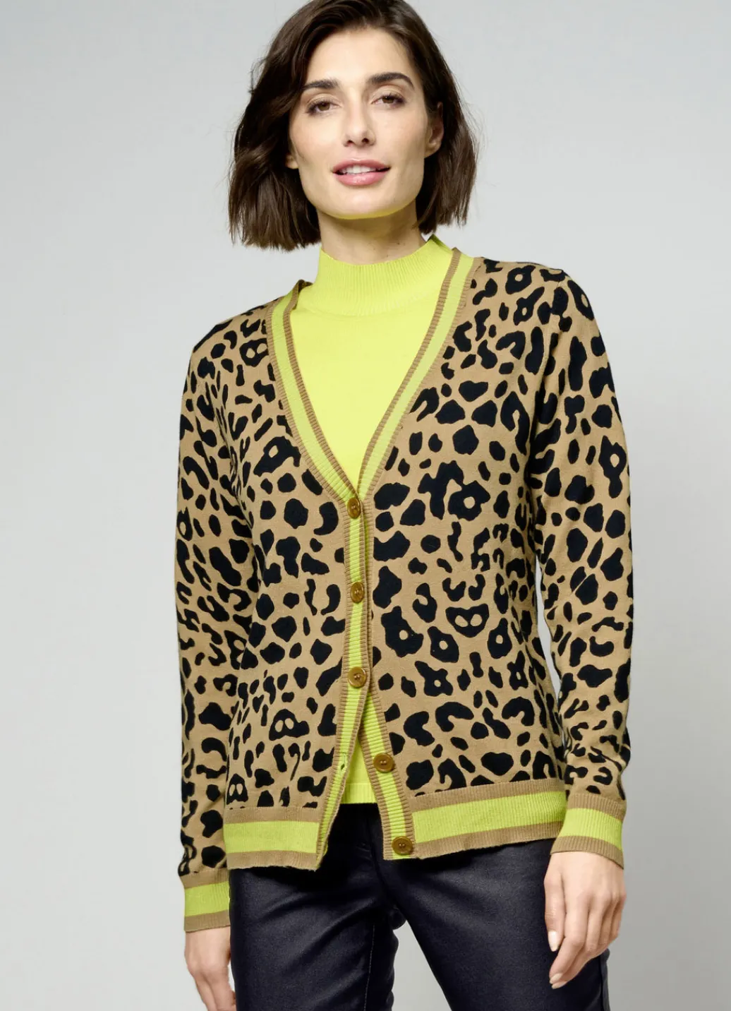 Strickjacke mit Tierfell-Optik in Camel-Schwarz-Limette und in Größe 52.