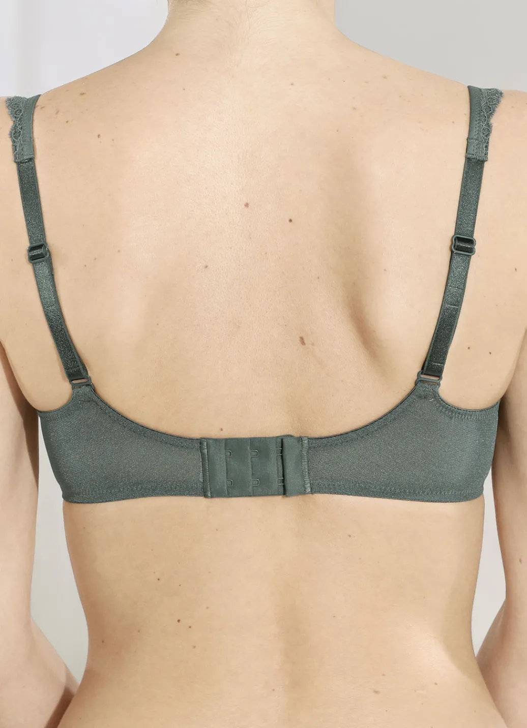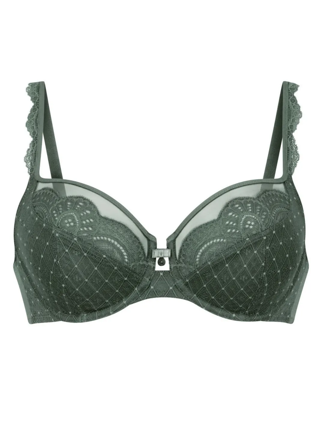 „Rosa Faia“-Bügel-BH in Wacholder, mit unterlegter Elastikspitze im Vorderteil, Elastiktüll am Dekolleté sowie verstellbaren Stretchträgern. Ab Cup F zusätzlich mit seitlicher Cupverstärkung und verstärktem Rückteil gearbeitet.
