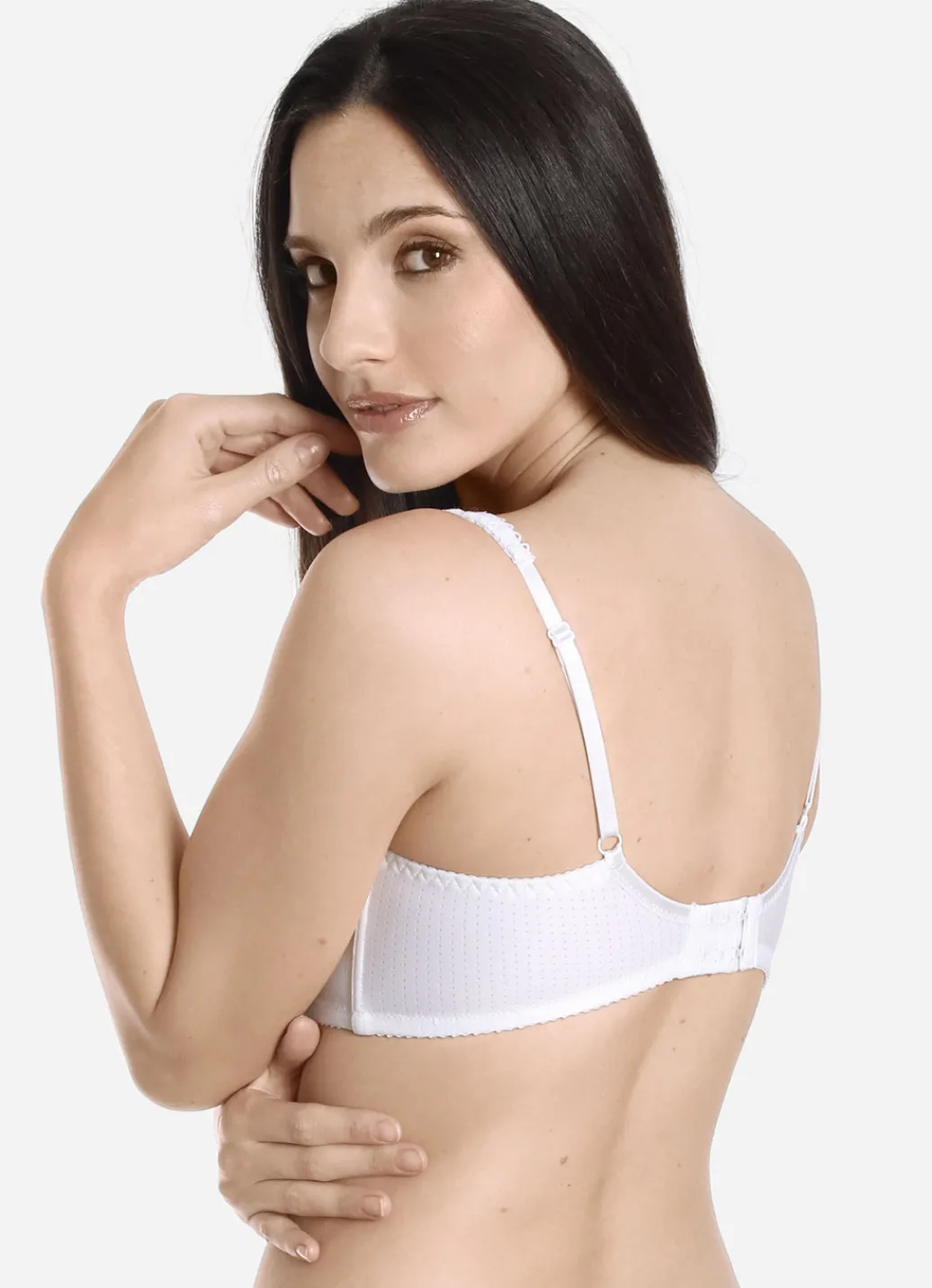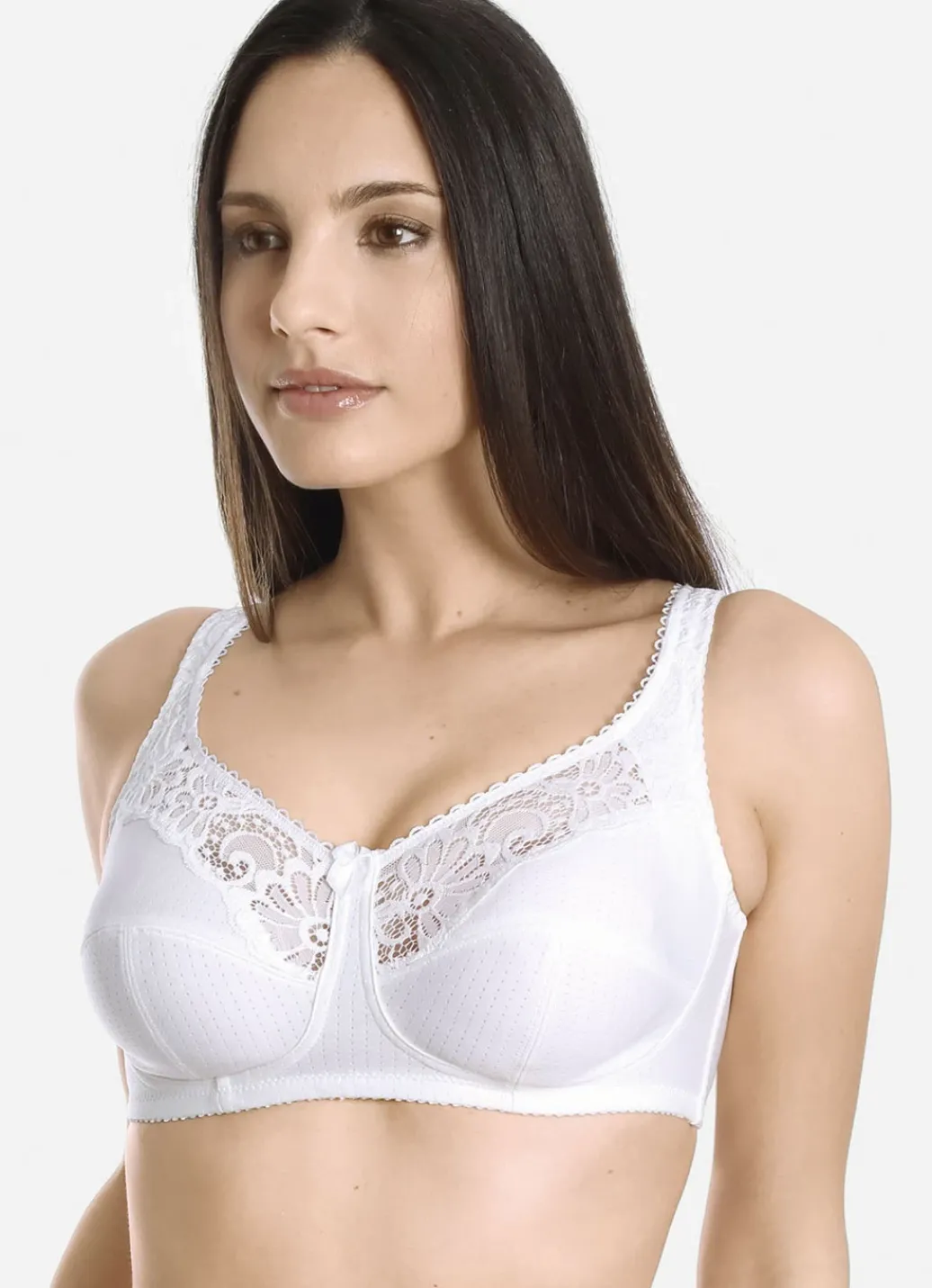 Dezent strukturierter „Sassa“-BH mit Elastikspitze am Dekolleté, unterlegten Cups mit seitlicher Verstärkung, seitlichen Stützstäbchen, verstärktem Rückteil sowie verstellbaren Stretchträgern.