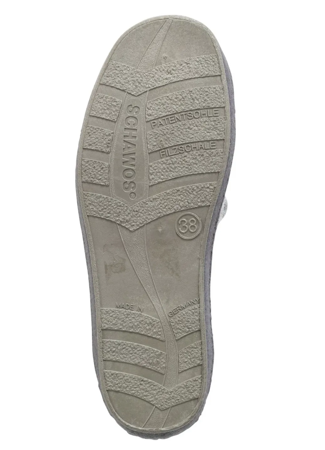 Floral bedruckter Wollfilz-Hausschuh in Grau: seitlich eingesetzte Gummizüge, Wollfilz-Fußbett mit Fersenluftpolster, Filzschalensohle, TR-Laufsohle sowie 25 mm Keilabsatz