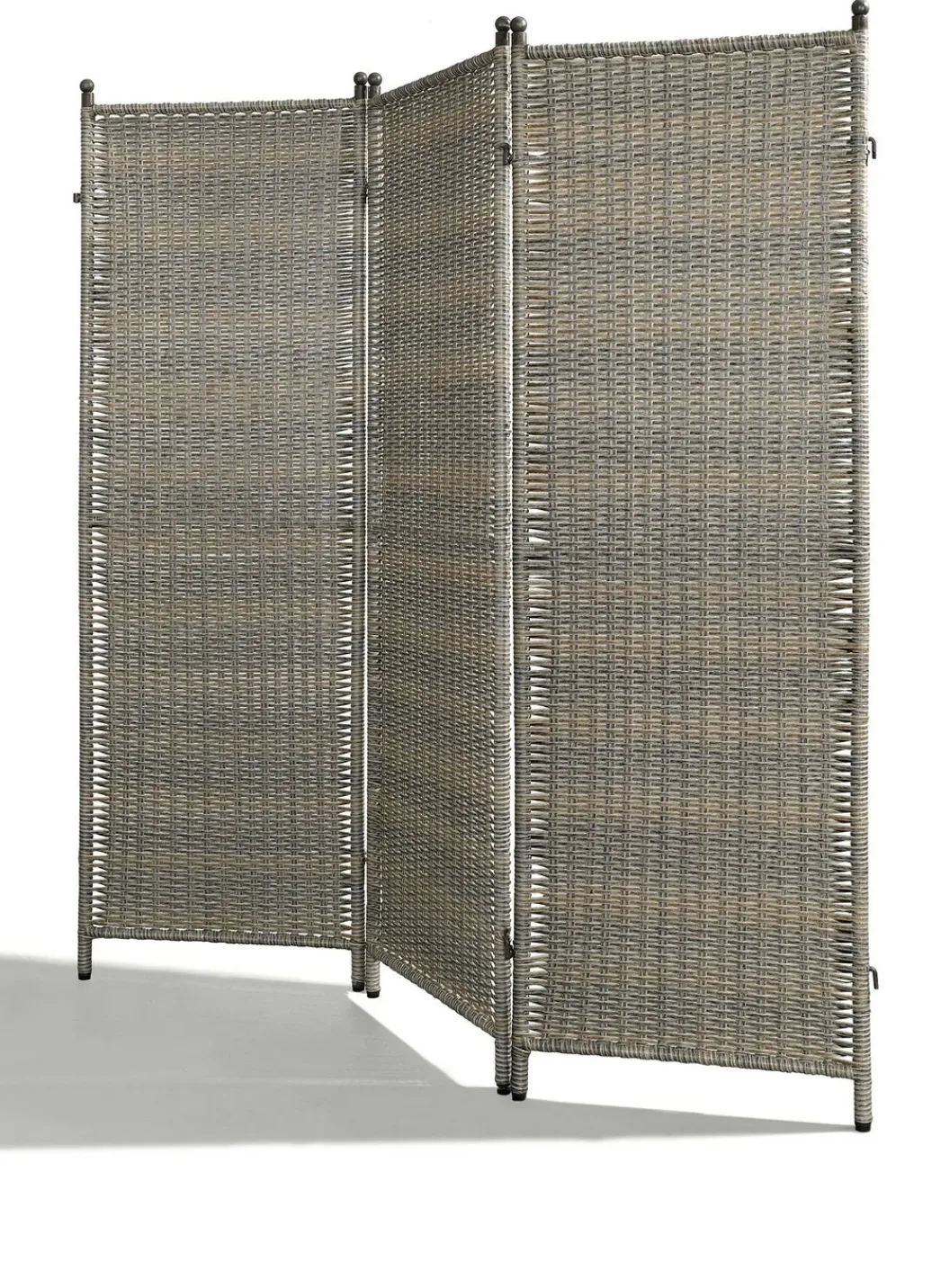 Mit diesem Paravent schaffen Sie ganz einfach mehr Privatsphäre in Ihrem Garten, auf der Terrasse oder dem Balkon. Er schützt vor unerwünschten Blicken, kann aber auch als Raumteiler oder Sonnenschutz verwendet werden und ist zudem beliebig erweiterbar. Das strapazierfähige und witterungsbeständige Kunststoffgeflecht in naturgrau ist von Hand auf ein stabiles, pulverbeschichtetes Stahlgestell gearbeitet.