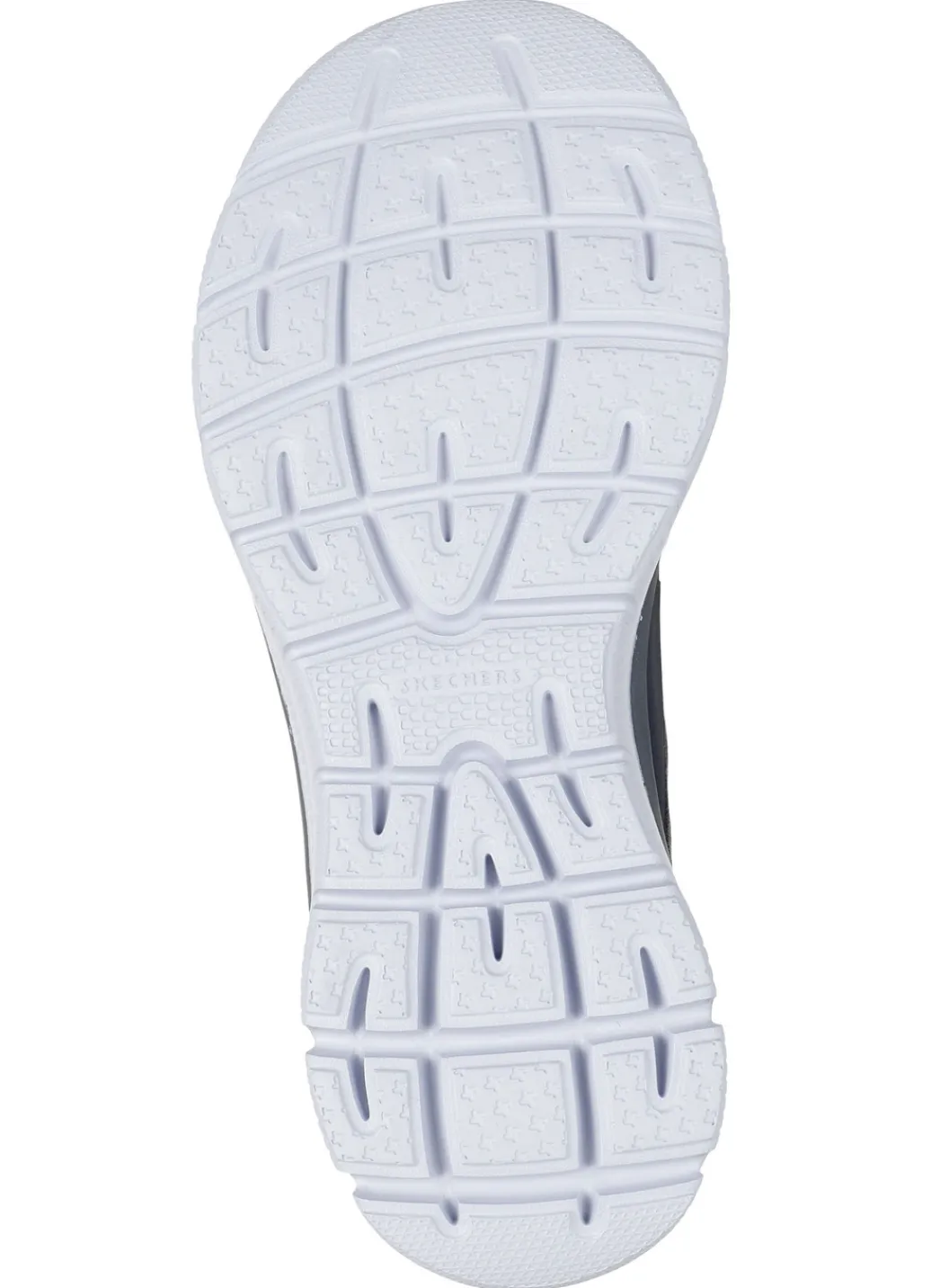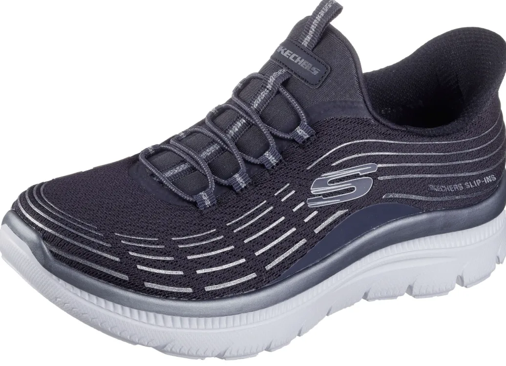 SKECHERS, stylische Damen-Sneaker, mit geformter Slip-Ins Fersenplatte in Dunkelblau-Silber und in Größe 36.