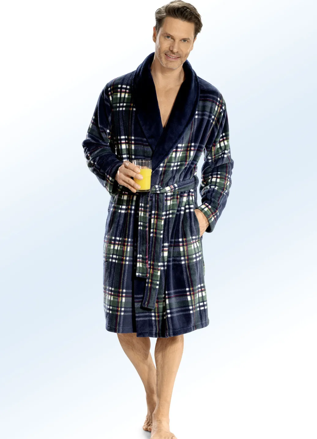 Hausmantel mit Schalkragen in Marine-Bunt und in Größe 62.