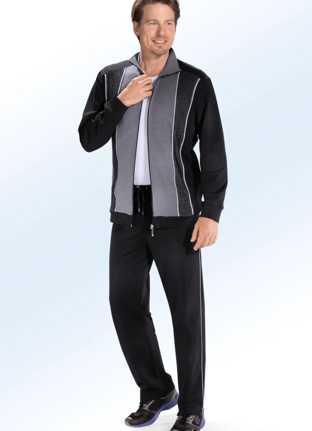 Komfortabler, schwarz-grauer Freizeitanzug: Oberteil mit durchgehendem Reißverschluss, Seitentaschen, elastischen Abschlüssen an den Ärmeln und am Saum sowie Kontrasteinsatz und Paspel im Vorderteil. Hose mit Kordelzug im Dehnbund, Seitentaschen, seitlicher Paspel sowie geraden Beinabschlüssen.