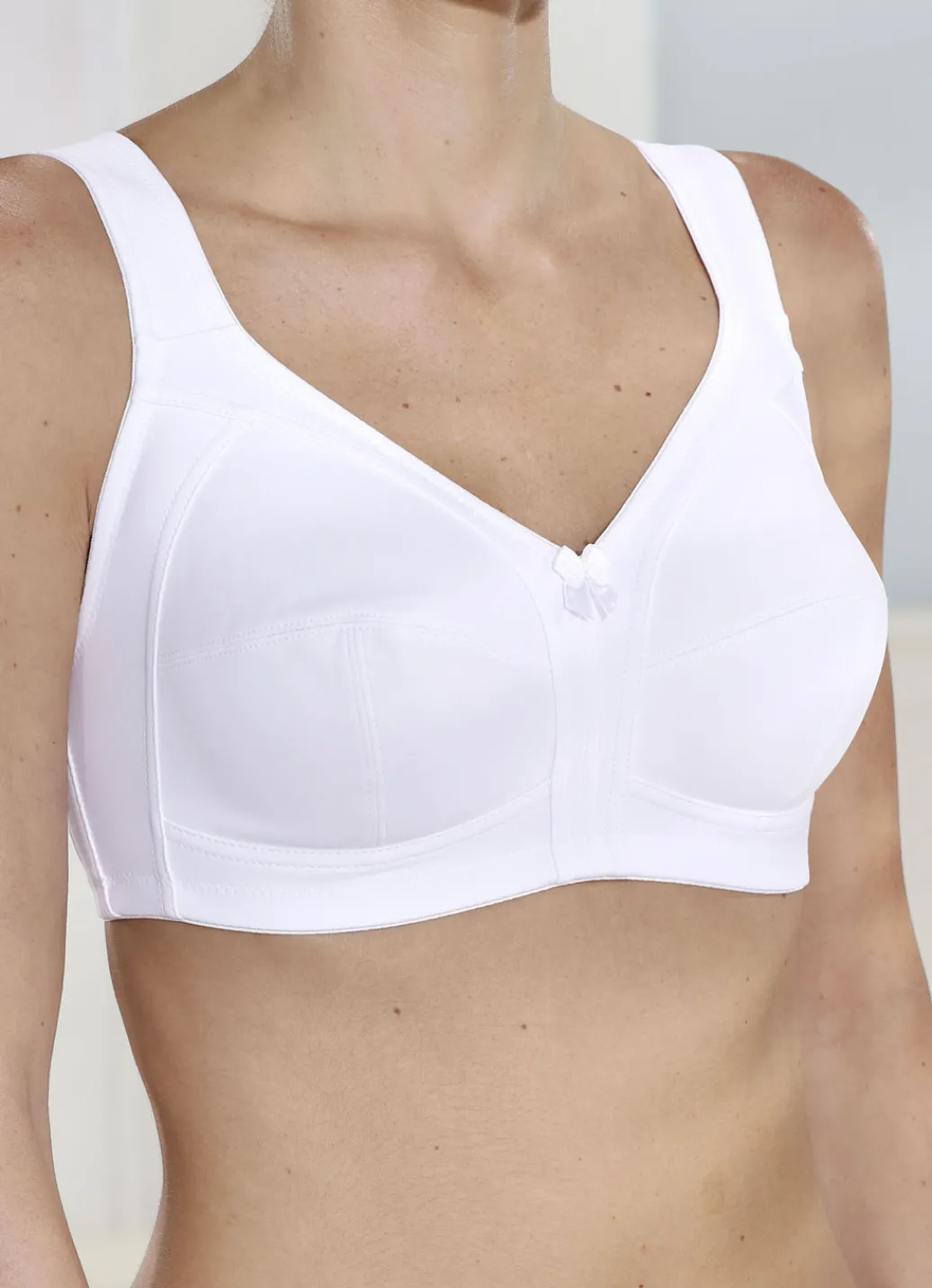 Weißer „Susa“-BH mit weich unterlegtem Vorderteil, seitlichen Stützstäbchen, verstärktem Rückteil sowie breiten, verstellbaren Stretchträgern.