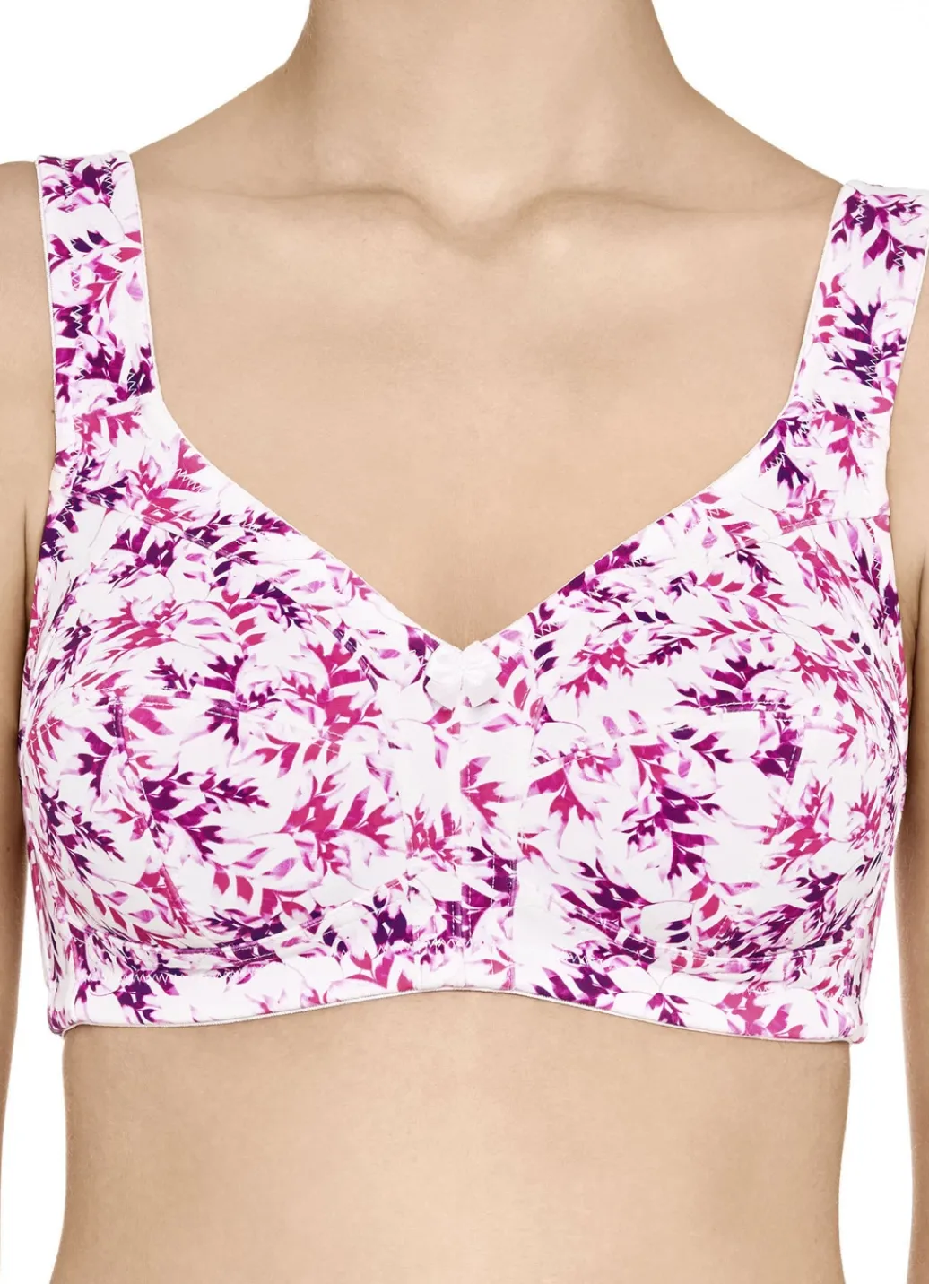 Ecrufarbener „Susa“-BH mit farbharmonischem Floraldruck, unterlegtem Vorderteil, seitlichen Stützstäbchen, verstärktem Rückteil sowie breiten, verstellbaren Stretchträgern.