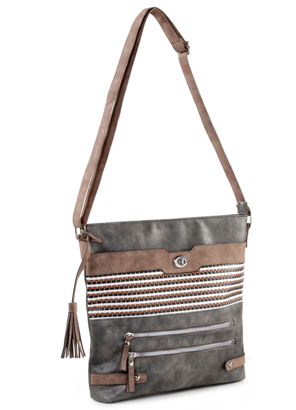 Tasche aus schattiertem Synthetikmaterial, mit teilweise glitzernden Flechtdurchzügen: Reißverschluss-Hauptfach, vier Reißverschlussfächer, ein Fach mit Drehverschluss, Futter. Ein verstellbarer Umhängeriemen ca. 66-130 cm Gr: 33x30x5 cm