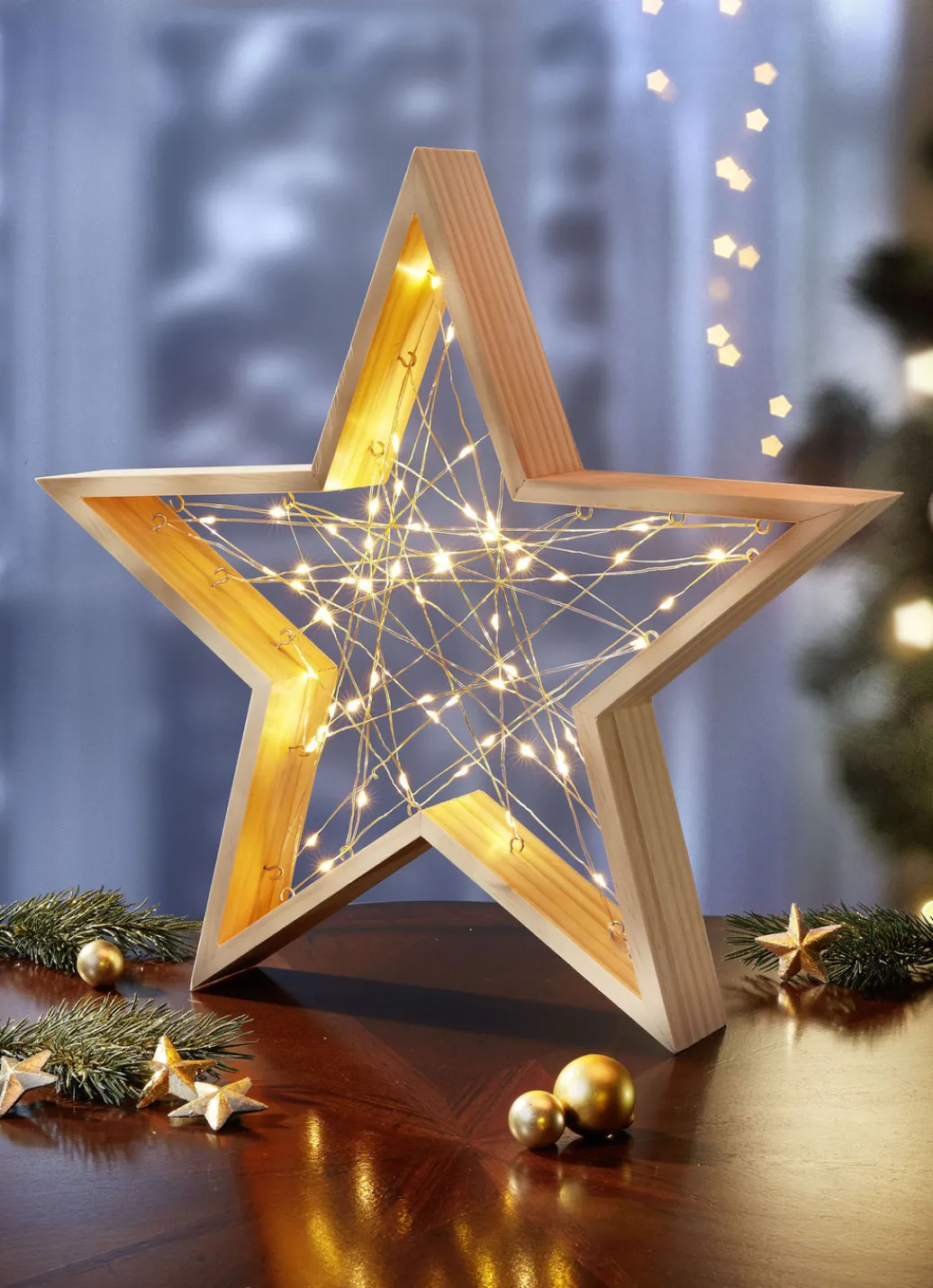 Herrlicher Stern aus Holz, mit einem Lichterketten-Geflecht, das mit 60 warmweißen LEDs geschmückt wurde – ein wahrhaft festlicher Schmuck, egal ob auf der Fensterbank oder dem Regal. Batteriebetrieben mit 3x 1,5 Volt Mignon (im Lieferumfang enthalten). Mit 6-Stunden-Timer-Funktion. Zuleitung zum Batteriefach ca. 50 cm. Maße: ca. B35,5xH34,5xT5,5 cm.