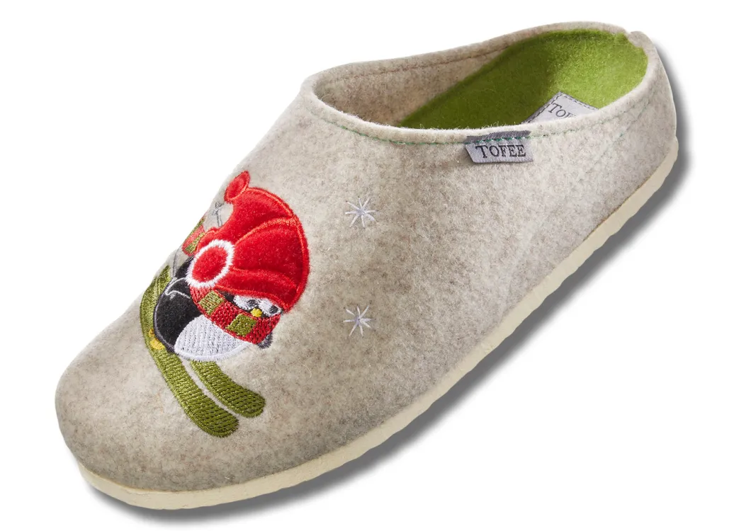 Ein niedlicher Pingiun auf Skier als Applikation schmückt diesen superbequemen, kuschelwarmen Hausschuh. Obermaterial aus Wollfilz. Anatomisch geformtes Fußbett mit Zehengriff. Microzell- Laufsohle mit 30 mm Keilabsatz. Die angenehme Qualität: Wolle und Polyester. Gr. 36-42.