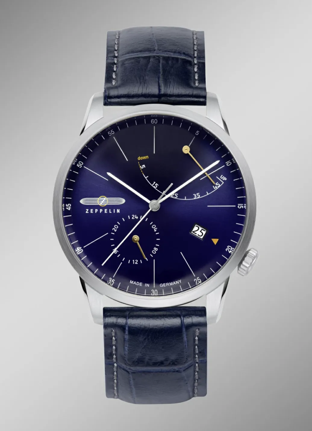 „Zeppelin“-Automatik-Herrenuhr mit Gehäuse aus Edelstahl und mit einem Uhrenband aus Leder.