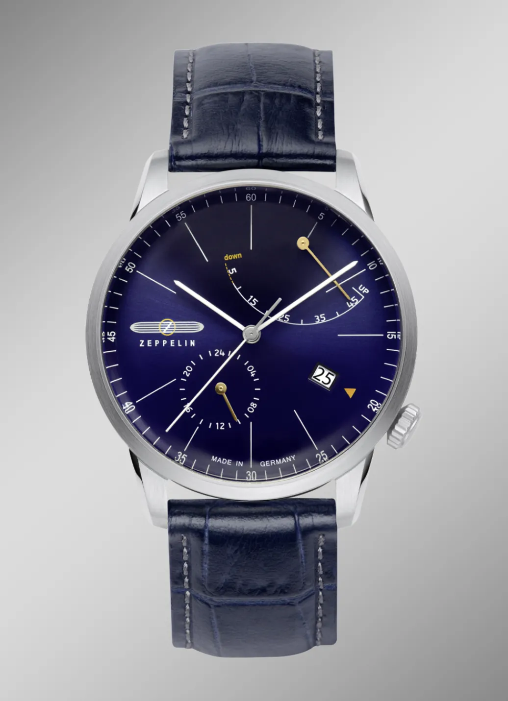 Klassische Automatik-Herrenuhr der „Zeppeli“-Serie „Flatline“ aus dem Hause POINT tec Electronic GmbH. Die Herrenuhr hat ein poliertes Edelstahlgehäuse, ein dunkelblaues Lederband mit Kroko-Prägung und Mineralglas. Auf dem eleganten dunkelblauen Zifferblatt gibt es eine Datums-, eine 24-Stunden- und einen Gangreserven-Anzeige. Durch den Glasboden kann man das Werk sehen, welches auf 26 Steinen gelagert ist. Die Herrenuhr ist 5 bar wasserdicht und hat einen Gehäusedurchmesser von 40mm.