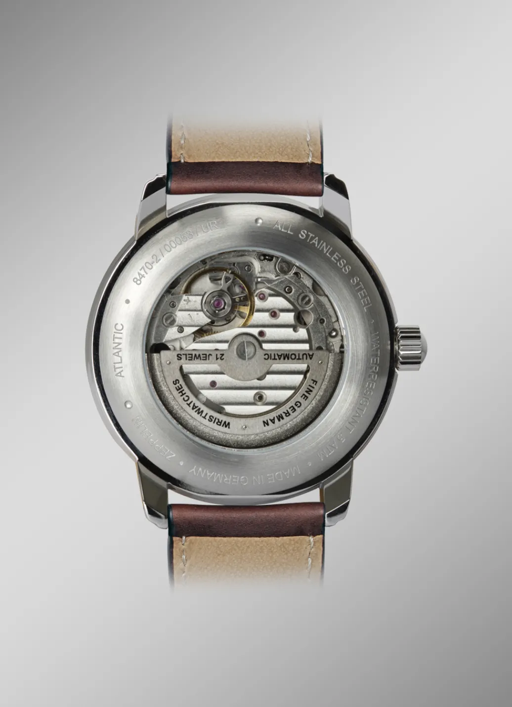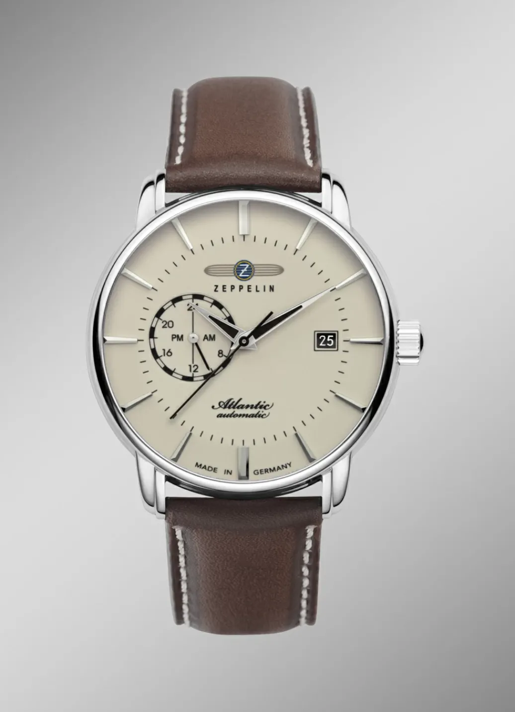Die Begeisterung für die technische Meisterleistung einer Atlantiküberquerung in einem der eleganten und komfortabel ausgestatten Luftschiffe wurde dem neuen Modell ZEPPELIN Atlantic von seinen Designern mit auf den Weg gegeben. Gehäuseböden mit eingesetztem Mineralglas geben den Blick auf das Uhrwerk frei. Aus feinem italienischem Kalbsleder wird in Handarbeit in Italien das Armband gefertigt. Der Hersteller PointTec aus München mit seiner eigenen Produktionsstätte in Ruhla, Thüringen verfügt mit 30 Jahre Erfahrung über ein hervorragendes Know-how in der Herstellung von Uhren.