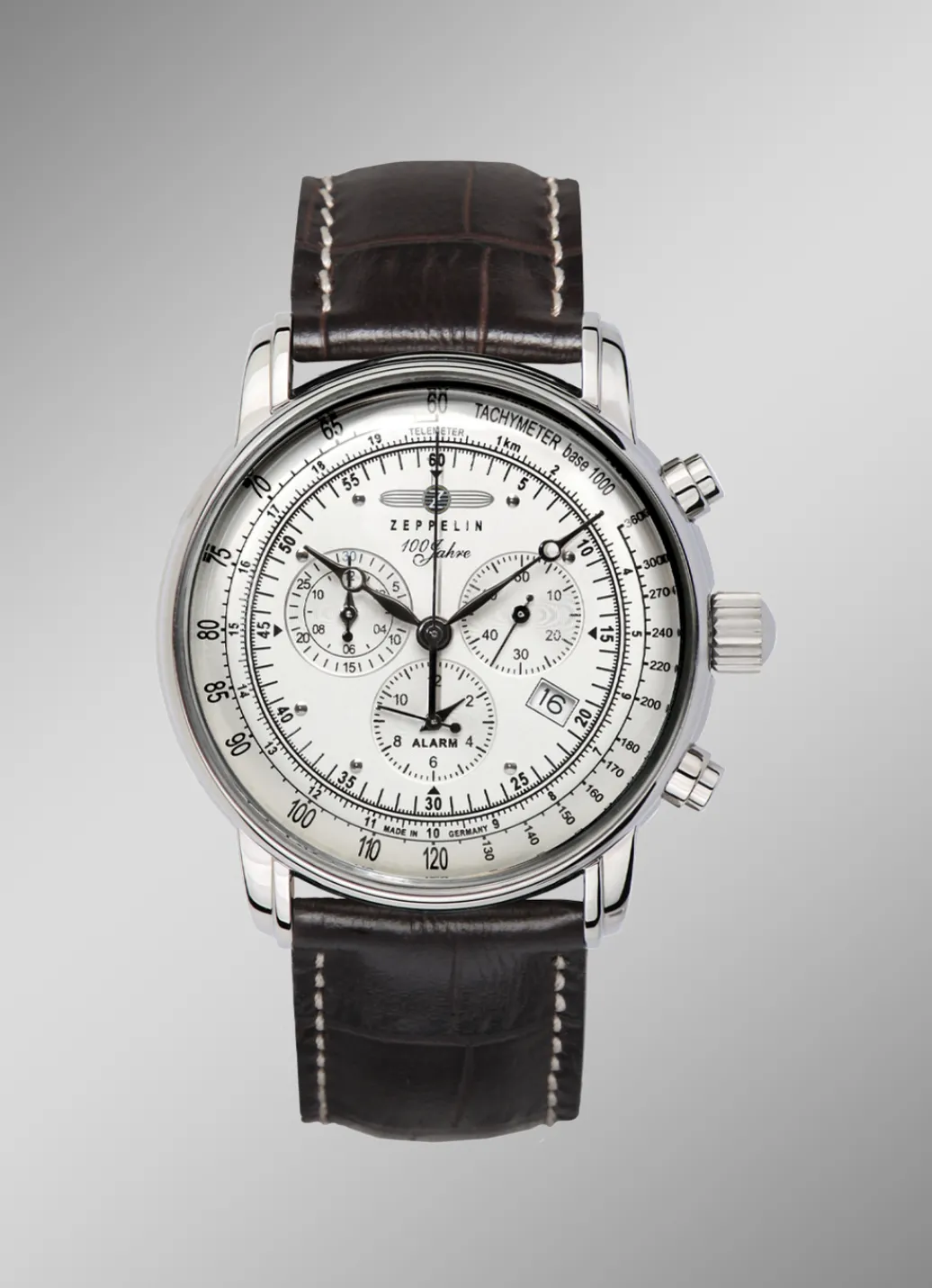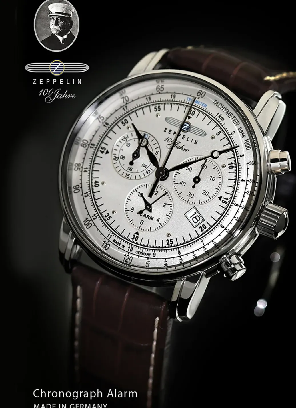 In Erinnerung an das 100-jährige Jubiläum von Zeppelin entstand die Serie 100 Jahre Zeppelin und steht mit perfekten Proportionenund herausragenden Features für jahrelanges Traditionsbewusstsein und ein zeitloses Lebensgefühl. Detailverliebt setzt sich die klassische Struktur dieses Modells bis in die abstrahierte Minutenanzeige fort. Der Alarm Chronograph begeistert sowohl mit seiner 12-Stunden-Stoppfunktion wie auch mit dem quarzgesteuerten Ronda 5130.D Uhrwerk.