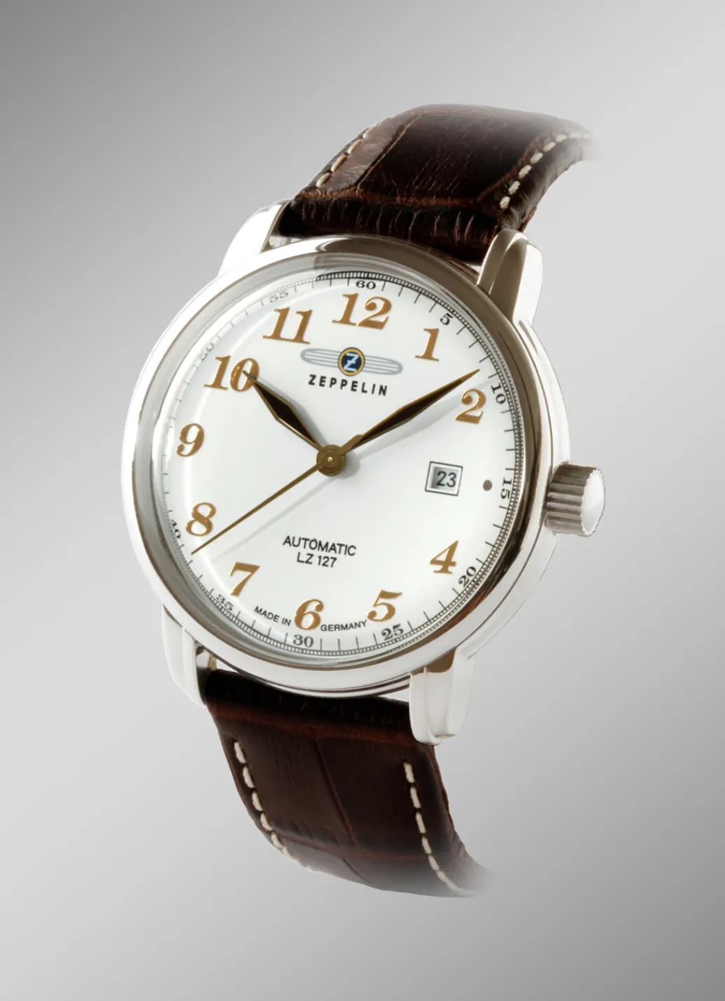 Klassische Automatik-Herrenuhr der Serie „Graf Zeppelin“ aus dem Hause POINT tec Electronic GmbH. Diese Uhr ist Ferdinand Graf von Zeppelin gewidmet, der sein Leben und seine Leidenschaft der Luftschifffahrt verschrieben hatte. Die Herrenuhr hat ein handgearbeitetes Edelstahlgehäuse, ein braunes Lederband mit Kroko-Prägung und Mineralglas. Die Uhr hat eine Datums-Anzeige und einen Glasboden, durch den man das auf 21 Steinen gelagerte Werk sehen kann. Die Herrenuhr ist 5 bar wasserdicht und hat einen Gehäusedurchmesser von 40mm.